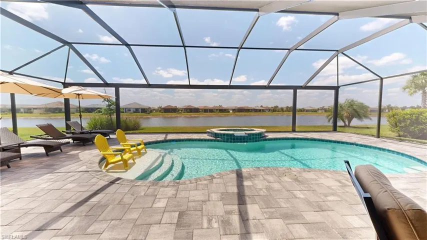 Del Webb Naples, Exceptionally Optioned “Stardom” Model Estate/Echelon Series Home w/Heated Custom Pool & Spa, Impact Windows & Doors, on Premium Water Lot, Stunning Lake Views, Stone Front Elevation, 2318 Sq.Ft. 2815 Total Sq.Ft.