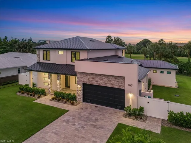 Modern Coastal Newer Construction, NO HOA, two story Arthur Rutenberg (ARHomes) with stunning western sunset views of the Naples Country Club golf course. This light filled, high ceiling, 5 bedroom + den/flex room, 4 bathroom home is situated on .29 acre and fenced for privacy.