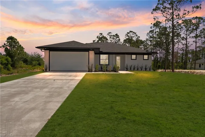 Welcome to this stunning New Construction Pool Home located in a highly sought-after Cape Coral neighborhood. This exceptional residence greets you with a grand circular paver driveway, a nicely landscaped garden, and a spacious three-car garage.