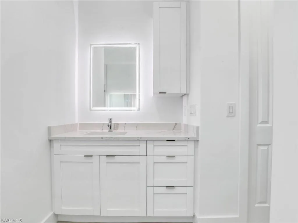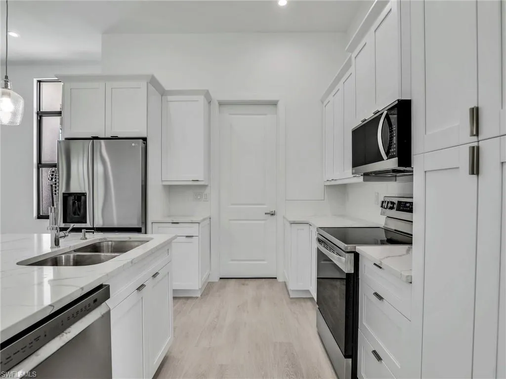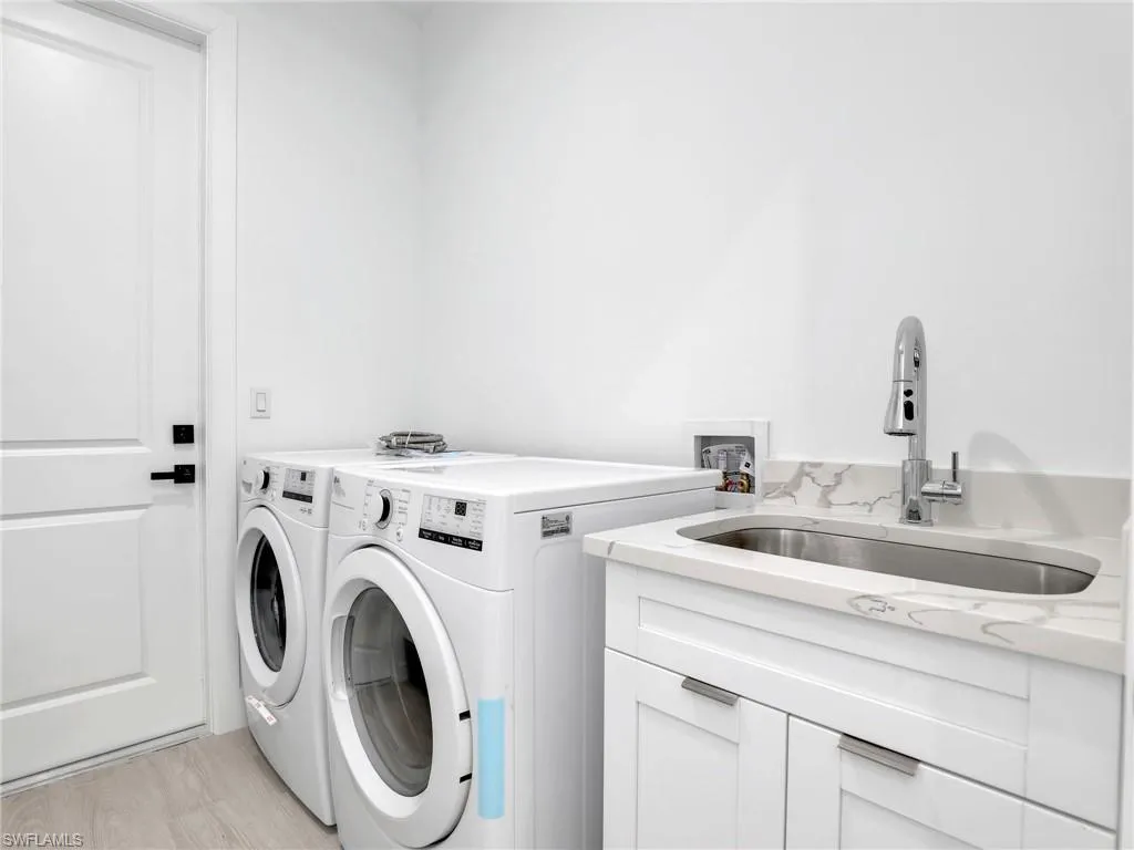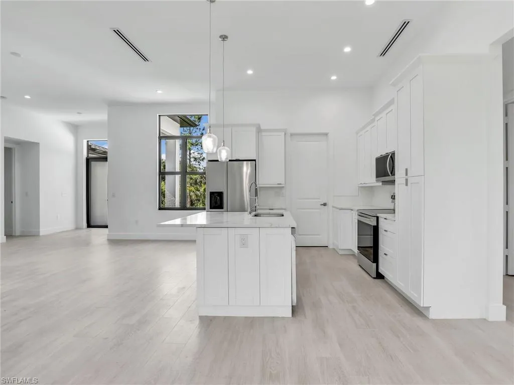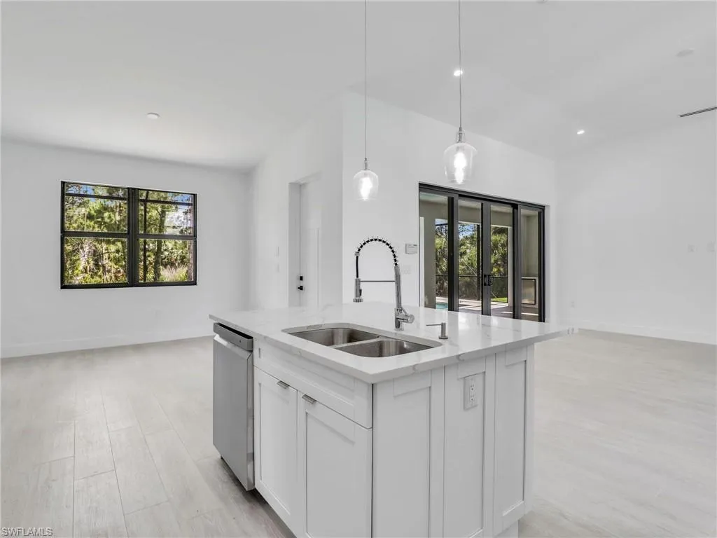 Wood look tile throughout home with all white shaker cabinets and Calacatta quartz countertops. The Great Room as you walk in has a 4-panel slider and eye-catching view of pool in lanai area. Kitchen island equipped with sink and dishwasher has gorgeous pendant lights over counter seats. Matching stainless steel LG appliances to include the washer and dryer in laundry/mud room. The dining room has a door leading to pool area and window views of backyard. All hurricane impact windows and doors. Ample spaced master bedroom with double doors leading to lanai and his and hers closets. Double vanity (separate) in master bath with LED antifog mirrors and large walk-in shower. Toilet privacy. The other 2 bedrooms are nicely sized with side views of home. Hall bathroom has shower/tub and LED antifog mirror with a linen closet for convenience in the hall. Laundry room doubles as a mud room coming in from Garage area into home, offering pantry space and sitting with a Wash sink. The screened in lanai is under roof with cabinets, sink and mini fridge for comfortable entertainment. Enjoy the integrated spa in this modern underground pool. Reverse Osmosis filtration system installed. All uplands back yard with ample space for additions to home.