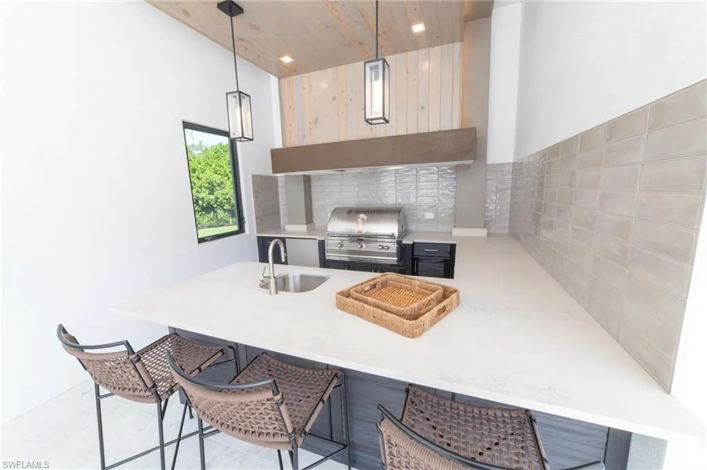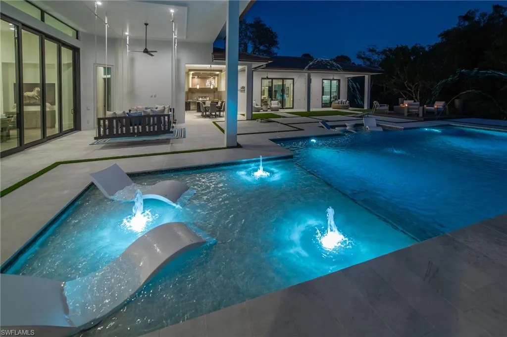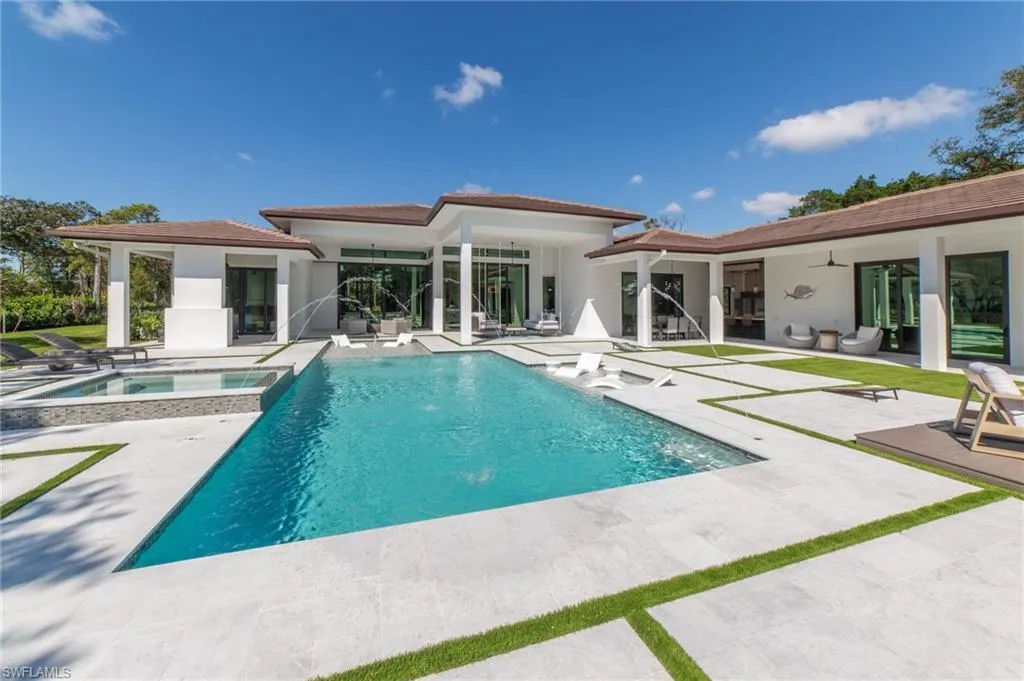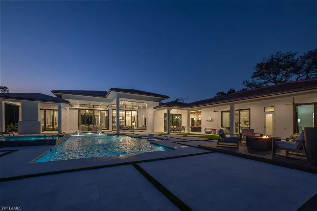 NEW CONSTRUCTION WITH WARRANTY- FURNISHED & READY FOR OCCUPANCY – Located on over an acre of land in Pine Ridge, yet less than 2 miles to the beach, this custom home by Arthur Rutenberg Homes features a modern design with luxurious warmth. The main house features a spacious great room, gourmet kitchen, casual dining area, 3 ensuite bedrooms, a den, flex room, prep kitchen, home delivery center and 4 car garage. Attached by an extended covered cabana and outdoor kitchen is a Casita that offers a private bedroom, bath, kitchen and living room….. perfect for visiting family. With over 900 sf of covered outdoor living space surrounding the resort style pool/spa, outdoor kitchen and fireplace, this home is perfect for entertaining family and friends.