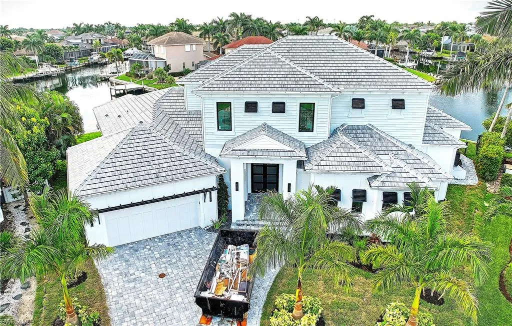 Sister home finished and available for viewing. Reserve now ahead of seasonal price increases. Beautiful coastal home on a diverging waterway with peaceful big water views on more than 170′ of new seawall. This stunning home offers more than 4000 square feet under air and a spacious covered lanai space featuring extensive custom outdoor kitchen. The covered lanai is protected by roll down screens/shades and hurricane shutters. The huge 2 1/2 car garage has a special 18′ impact overhead door and ceiling height enough for an auto stack for that special extra car and additional large air conditioned storage area. Numerous ceiling beams and custom wood finishes throughout the home. The windows and doors are all impact and UV resistant by PGT. The home is easy walking distance to public beach access, shopping and dining. Estimated completion date October 2025.
