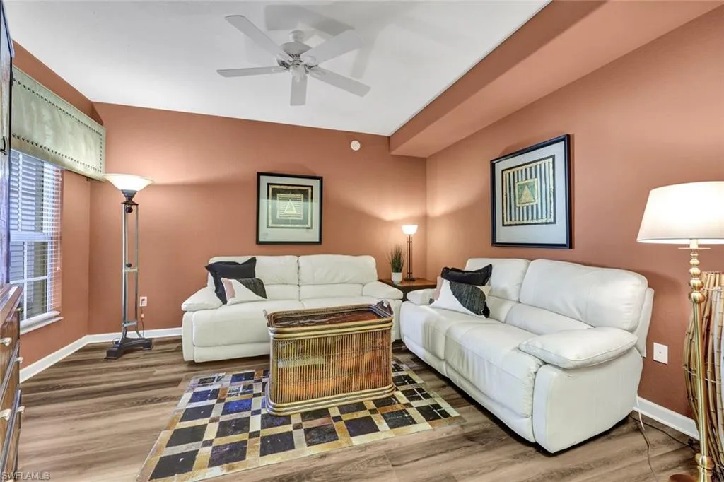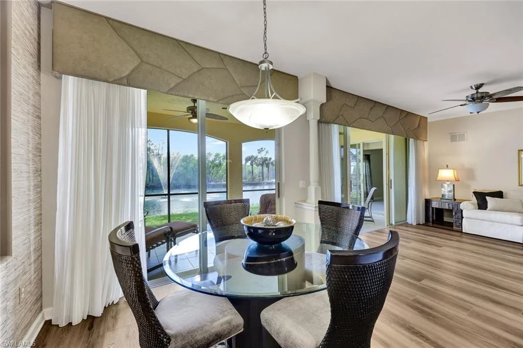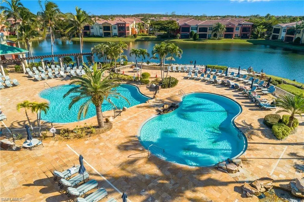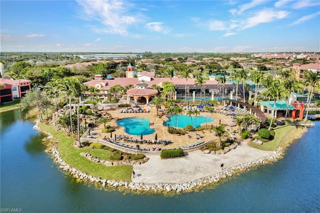 LAKE AND FOUNTAINS IN THE BACK AND FRONT! Rarely available, this gorgeous home is on the first floor, a Southern exposure with a large Lanai overlooking the South lake, fountain, and preserve in the main section of the community. NEW in 2024, custom closet organizers, all new kitchen appliances, several new ceiling fans, a new water heater, a new HVAC system, new GORGEOUS granite countertops, backsplash, kitchen sink and faucet, garbage disposal, and stunning wood laminate flooring throughout. All new matching granite countertops and tub surround in the primary suite with new sinks and faucets there too! This beauty comes artfully and tastefully furnished by a local decorating firm. Move in ready! The 2-car garage is oversized with incredible amounts of storage room for a workbench, motorcycle, long truck, or SUV as well. Rapallo sits in the main hub of Estero within walking distance to Coconut Point Mall, shops, dining, the new Williams Road Sports Park, and indoor pickleball at the nearby Estero Community Rec Center. Rapallo has its own clubhouse, 2 resort-style pools, a lap pool, a hot tub, tennis, fitness, bocce, and a walking path. If you missed your opportunity to own one of these homes last year, don’t snooze this time!