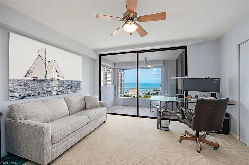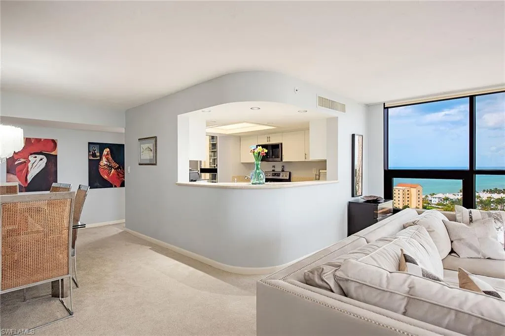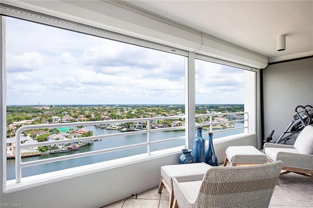 Indulge in panoramic views of the Gulf of Mexico and Venetian Bay from this beautiful beachfront condominium in the rarely available 01 Stack, located on the beach in Park Shore. The immaculate 16th-floor residence is tastefully finished and has a large living room surrounded in glass to enjoy Naples sunrises and sunsets. This residence boasts two lanais and a large primary suite. The Terraces has a dramatic multi-story entry, a social room with a full catering kitchen, a fitness center, a gorgeous pool, hot tub, fire pit, three guest suites, and 24-hour doorman. Walk to shopping and dining at Venetian Village and Waterside. Partake in boating with slips and boat rentals conveniently located across the street!