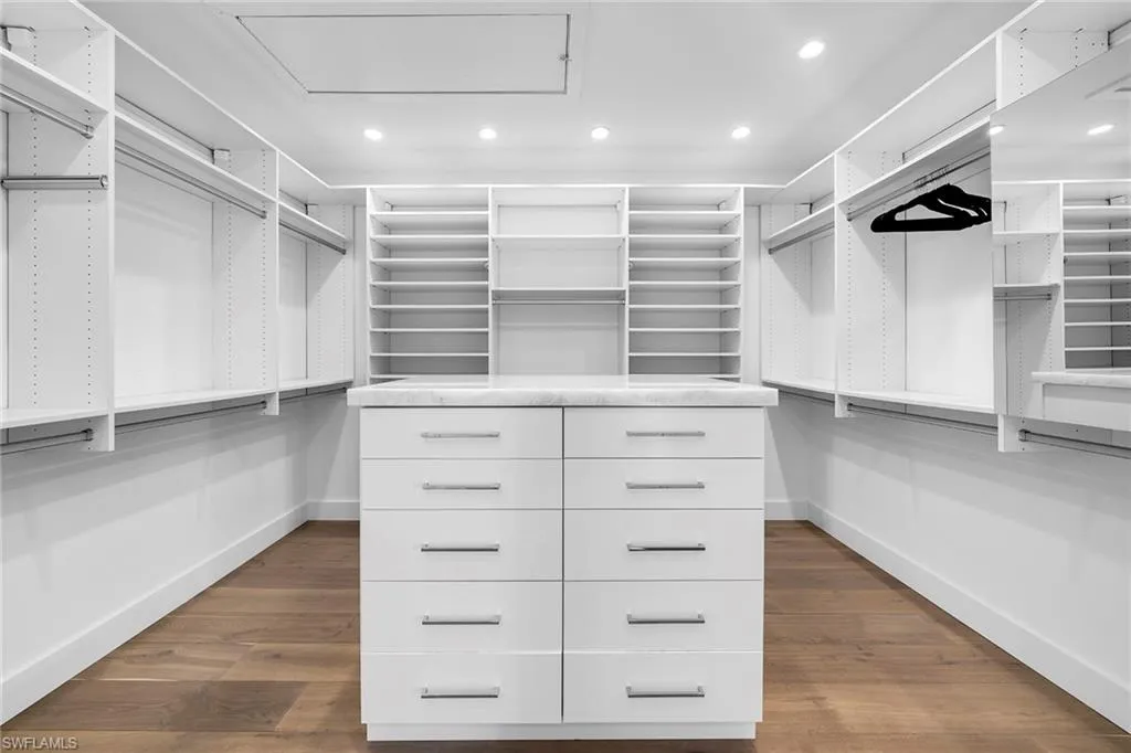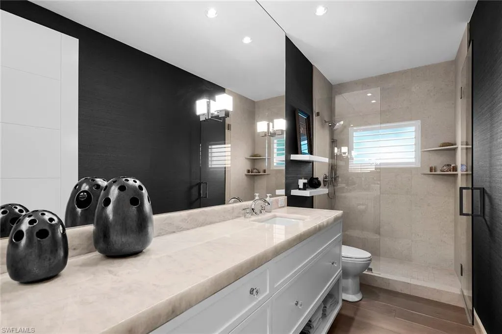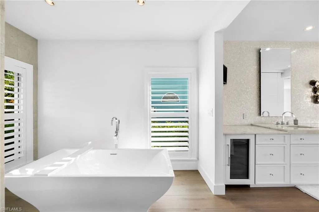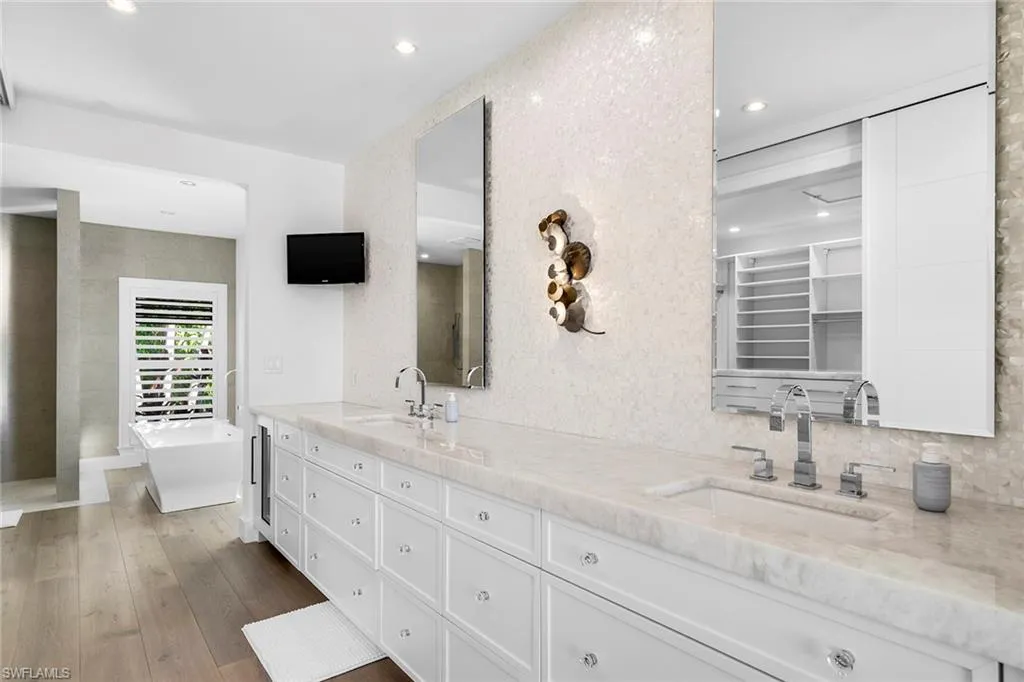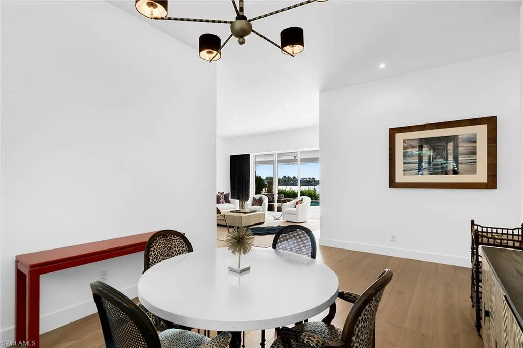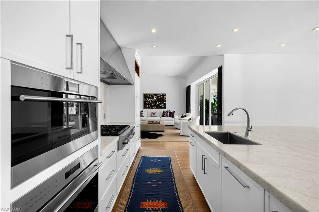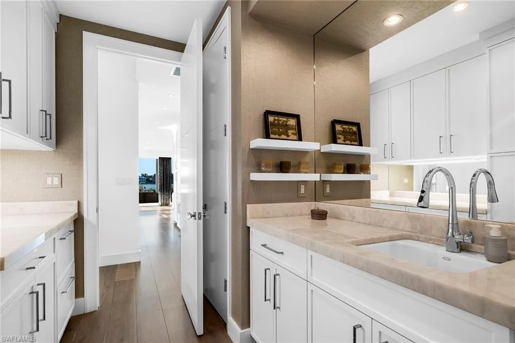 The well-appointed kitchen, complete with top-of-the-line appliances, a gas cooktop, stylish cabinetry, and an oversized island with seating, is a dream for those who love to cook. The oversized master bedroom adorned with a sparkling chandelier, indulges you in serenity, featuring a spacious walk-in closet and a spa-like ensuite, with a freestanding soaking tub and a zero-entry travertine shower. For the water enthusiast there is 100 feet of waterfront bliss, a private boat dock, and direct access to the Gulf of Mexico. Seize the rare chance to make this extraordinary residence your very own sanctuary or build your dream home on the irreplaceable lot.