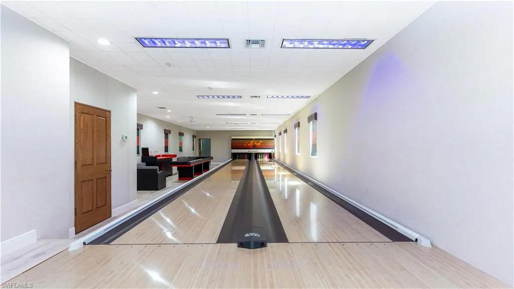 The home has endless options for fun, including a two-lane bowling alley, a game room, a movie room, a library with a rolling ladder, a recreation room, a wine room, and an exercise room with a sauna and bathroom. The large kitchen is ideal for hosting large gatherings, with a breakfast area and walk-in pantry and walk in wine cellar. The living room with cathedral ceilings has tall windows that bring in natural light and show off the grand fireplace and bar.
