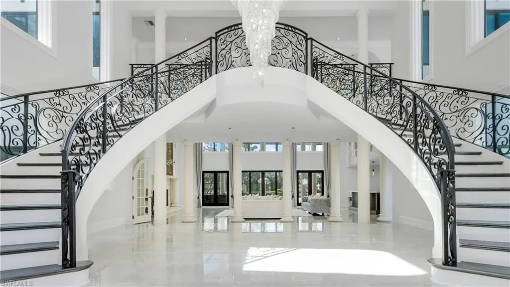 The home is over 20,400 square feet under air, with a circular driveway, fountain, and park-like grounds that lead to a grand entrance with a stunning staircase. Inside, you’ll find a 2,000 sq. ft. master suite with a private balcony, seven bedrooms with their own full bathrooms, walk-in closets and private balconies with water view. Separate maids quarters/ guest house with private entrance, kitchenette, full bathroom, walk-in closet and private patio.There’s a six-car garage and two additional garages for golf carts.