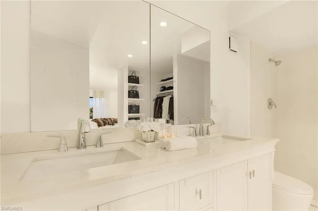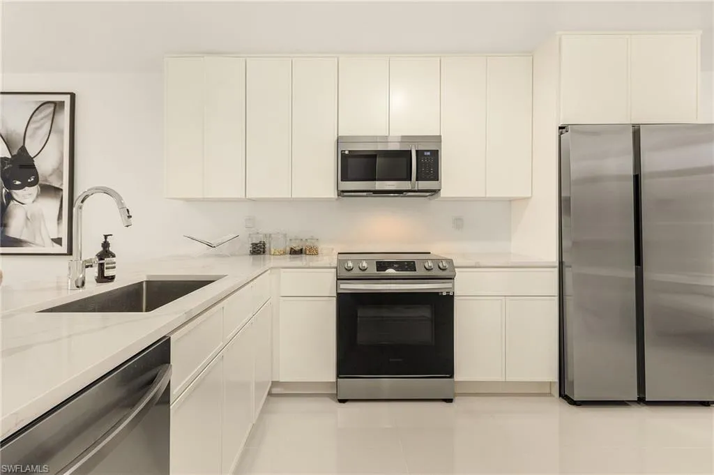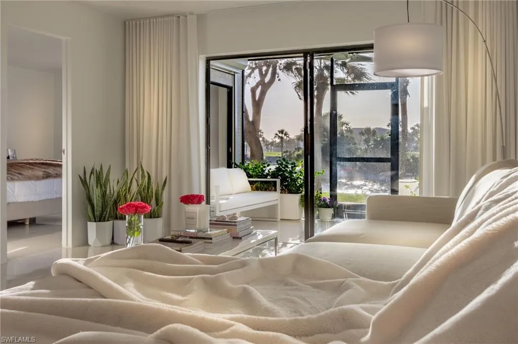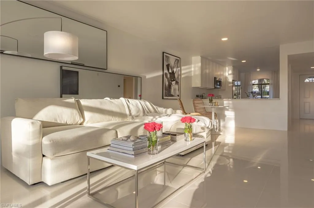 Gorgeous modern brand new fully remodeled condo, 2 miles from beach, facing west and the most beautiful daily sunsets! Building is 9 ft above sea level. Structural Integrity Inspection completed. Reserves fully funded. No Assessments. Located inside a private gated community with 18 hole golf course, clay tennis courts, newly remodeled private clubhouse with an amazing bar & restaurant. Condo remodeled with Aroma360 HVAC Scenting System, Trane XR-15 two ton Air Conditioner with REME Halo Anti-microbial UV Light & Linear Diffuser Vents, Samsung Stainless Steel Appliances, modern frameless Thin Shaker Kitchen Cabinets with grey Quartz countertops, LED recessed ceiling lights & Lutron Lighting Dimmer Switches throughout, Deep Soak Bathtub in Guest Bathroom, Kohler & Moen Kitchen/Bath Fixtures, Large Format High Gloss Porcelain Tile floors in a creamy Sand color installed with 1/32 sealed grout for a natural marble look, new remote control electric roll down Hurricane Shutters on all windows and doors, Custom California Closets, 87 inch wall mounted QLED Google Smart TV in Living Room, 60 inch wall mounted QLED Smart TVs in both bedrooms, custom made Ripple Fold drapery from “The Shade Store Naples” on all windows, brand new cellular/not wifi ADT Security & Fire Alarm System with 24 hour battery backup. All furniture & fixtures included in listing price.