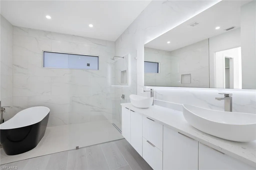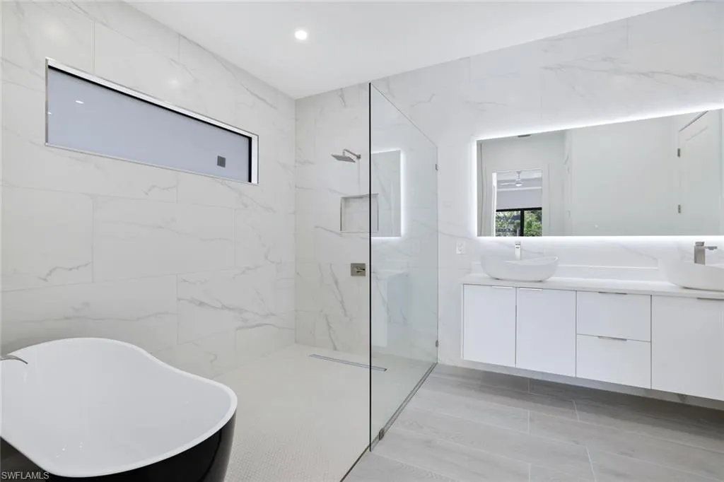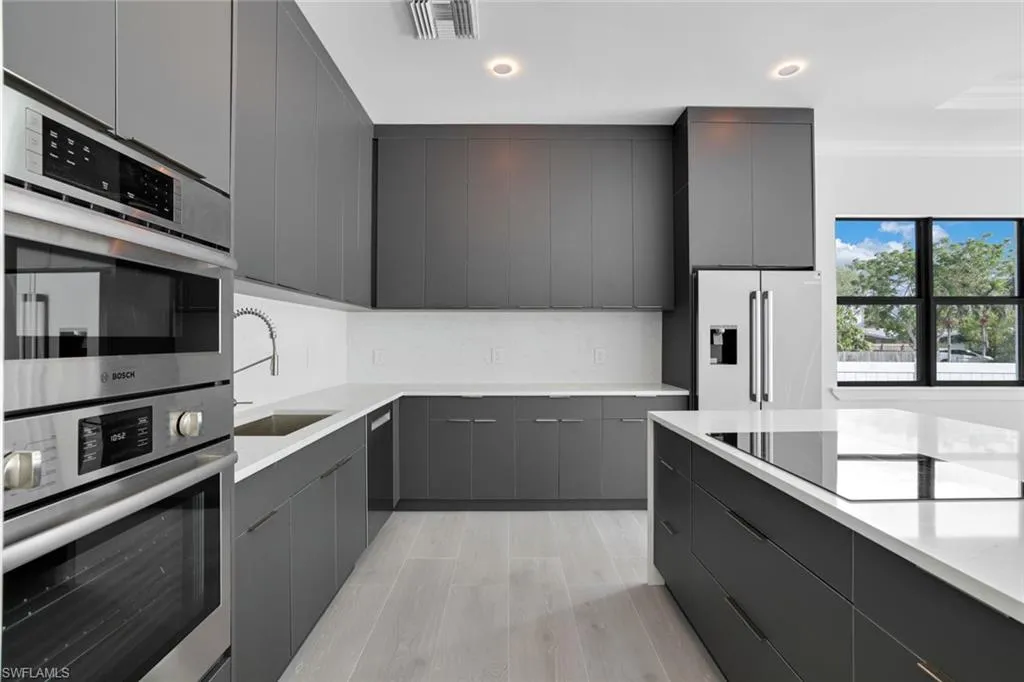 Home is 100% finished and ready to move! New construction on unbeatable location across from Park Shore. Ride your bike to the beach! This is an upcoming street with seven new construction homes under construction. Good investment opportunity. The home features high ceilings throughout. Modern kitchen cabinets and plank style porcelain tiles. The den is flexible and allows an opportunity for a fourth bedroom. The master suite offers a very large shower with tub. Excellent outdoor area with a salted and heated pool and spa and outdoor kitchen!