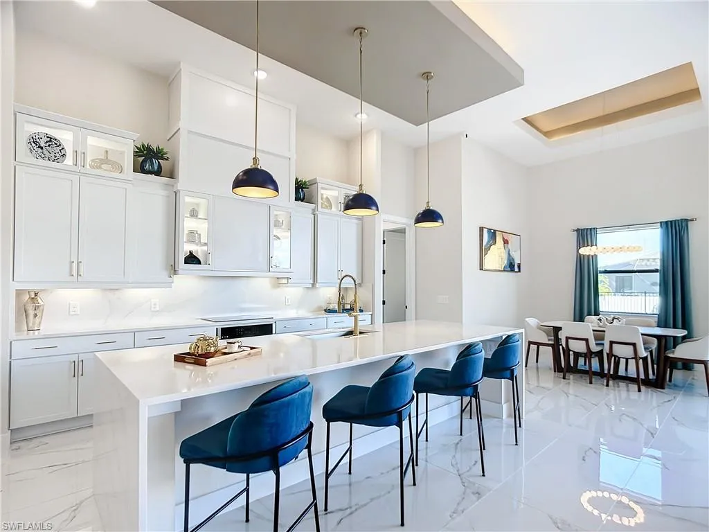 In the kitchen, you’ll find 42″ upper cabinets, stainless steel appliances, and a roomy 12-foot island, perfect for cooking and entertaining. The home includes 7 rooms with impressive tray ceilings reaching up to 14.5 feet high, adding character and elegance to every space.