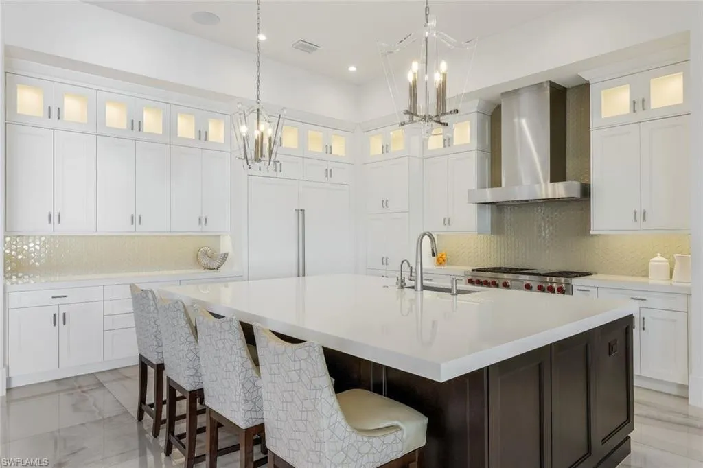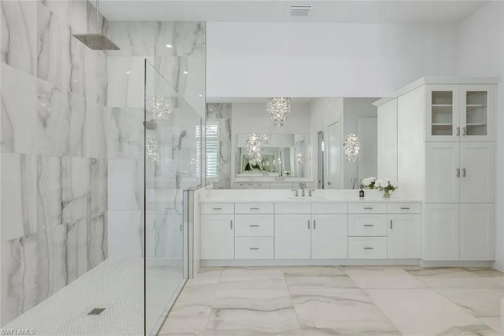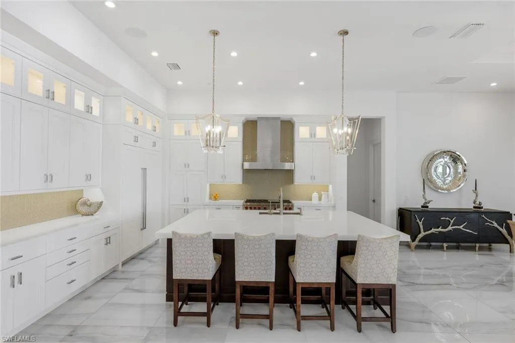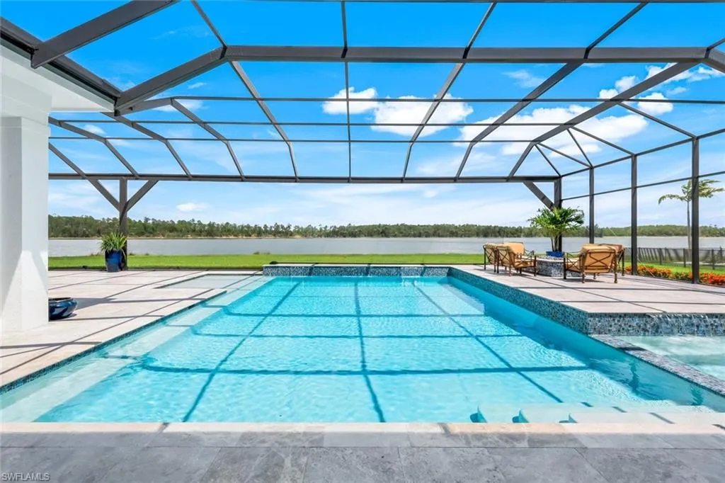 The outdoor living space redefines Florida luxury: marble pavers, a custom saltwater pool, a gas fireplace, firepit, and a fully-equipped summer kitchen featuring an Alfresco grill with built-in grill, griddle, and smoker — an entertainer’s dream. With breathtaking views of WildBlue’s iconic big lake, the backyard becomes your private oasis — and yes, you can even add your own dock for boating, kayaking, or jet skiing right from your backyard.