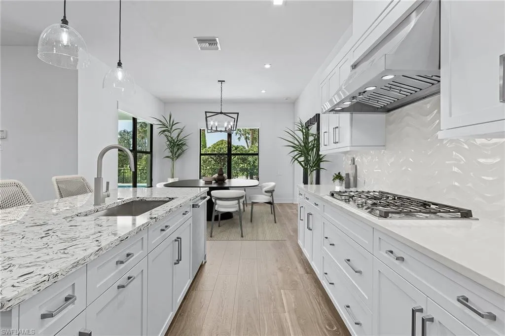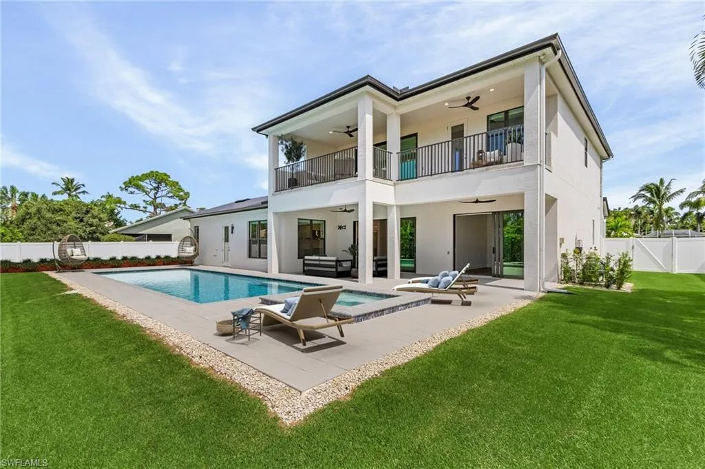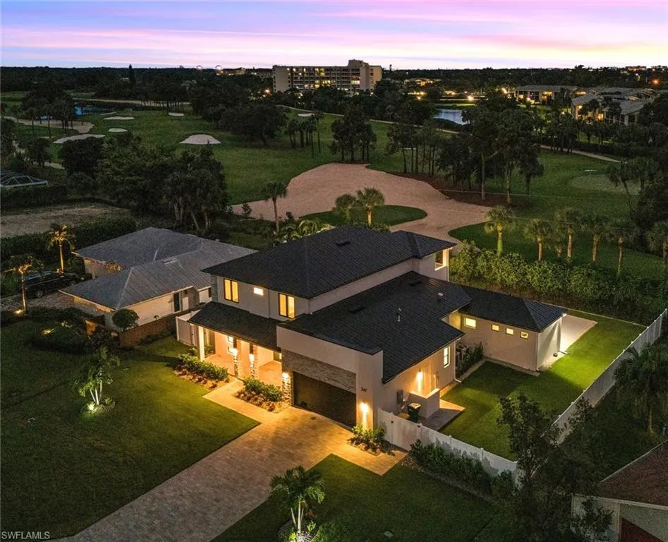 Modern Coastal Newer Construction, NO HOA, two story Arthur Rutenberg (ARHomes) with stunning western sunset views of the Naples Country Club golf course. This light filled, high ceiling, 5 bedroom + den/flex room, 4 bathroom home is situated on .29 acre and fenced for privacy. Enjoy the oversized lap length pool, spa and spacious lanai in this tranquil, centrally located Naples neighborhood with new construction at every corner. The home boosts an upstairs club room with wet bar, wine reserve, and oversized balcony to fully immerse in our sunsets. The master suite is located on the first floor with palm tree golf course views and large impact glass slider doors steps to the spa. The guest room and full pool bath are conveniently located on the first floor with pool lanai access. The modern design kitchen boosts gas cooktops, and double ovens with the latest in cooking technology offering multiple functions. Large kitchen island and dining area overlook the many views. Two bedrooms with oversized windows are upstairs with jack and jill bath. As well as a bedroom suite with golf course views and balcony access. The home features an oversized 2 car garage with EV plug in and storage space, laundry room with built in working desk, and additional storage under stairwell. 250 gallon buried propane gas tank services the pool, spa and kitchen. Get ready to move in with working security system, internet/cable and window coverings including black out shades in bedrooms. 347 Mel Jen Drive located in coveted Big Cypress Golf + Country Club with Naples Country Club golf course views is down the street from Clam Pass beach, Waterside Shops and A+ public and private schools. It is conveniently located to Naples greatest lifestyle offerings as the #1 place to live in the United States; US News & World report.