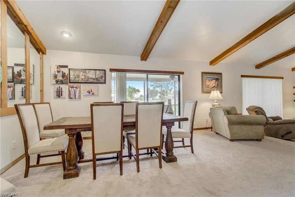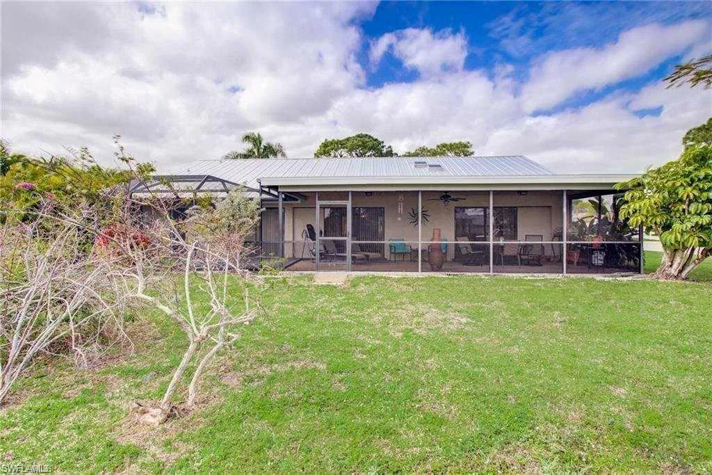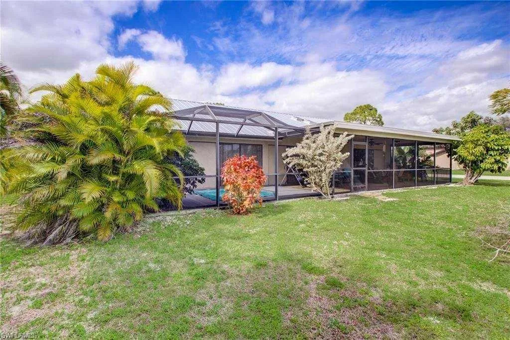 Riverbend a waterfront community. This home is situated on a generous corner lot in a tucked away neighborhood featuring quaint canal and upscale riverfront homes along the Caloosahatchee River in N Fort Myers! Walk into this open floor plan home and be welcomed with high cathedral wood beam ceilings. The screened in lanai overlooks the luscious backyard and even has an in ground spa to unwind in! This house boasts ample room for hosting with its large NEW kitchen with quartz counter tops. Eat in area, breakfast bar and adjacent dining room. It even has brand new carpet, a 2021 metal roof with new skylights and a newly renovated master shower and vanity. Enjoy the serene escape the Riverbend community offers while still being less than 2 miles away from your local Publix and only a 10 min drive from I-75. Expected to go fast so schedule a showing today!