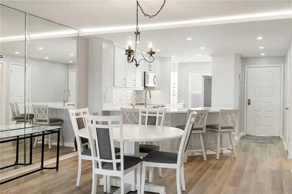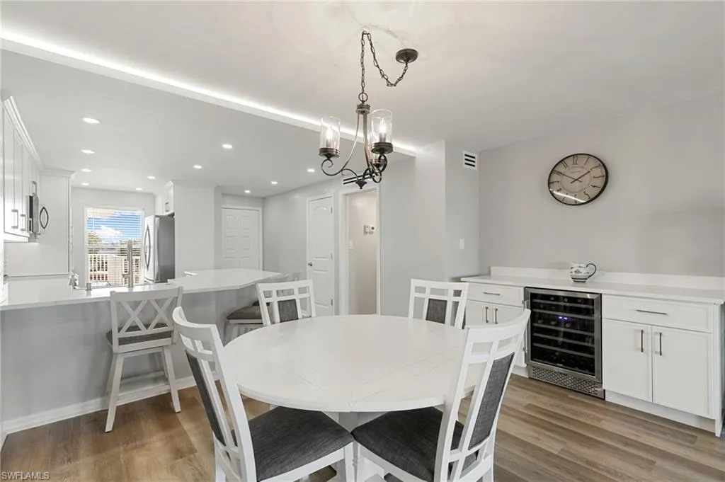 The just renovated kitchen is a chef’s dream, featuring sleek quartz countertops, custom cabinetry, and a modern touch with an induction range. In the dining area, a custom wine bar makes entertaining a breeze.