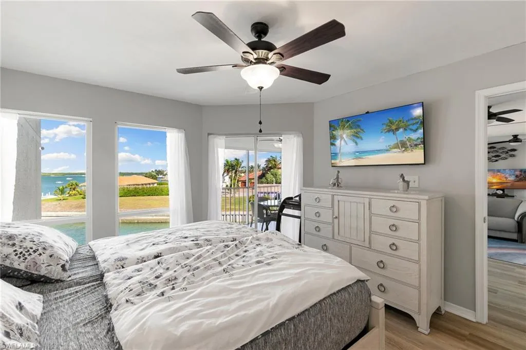 The primary suite with double vanities, beautifully tiled shower, and a walk-in closet is also a relaxing sanctuary, with doors out to the deck to soak in the serene water views and watch the boats glide by.