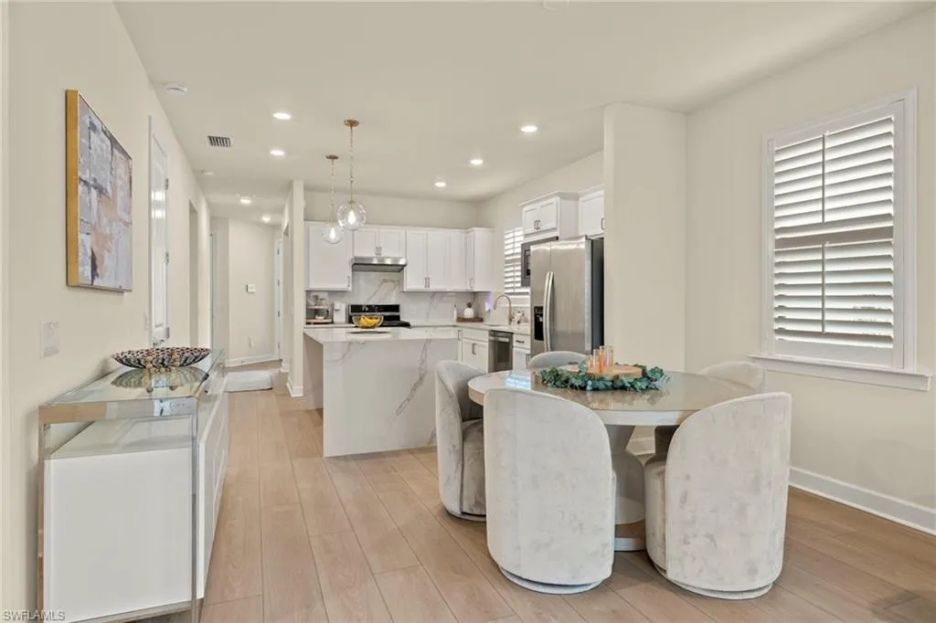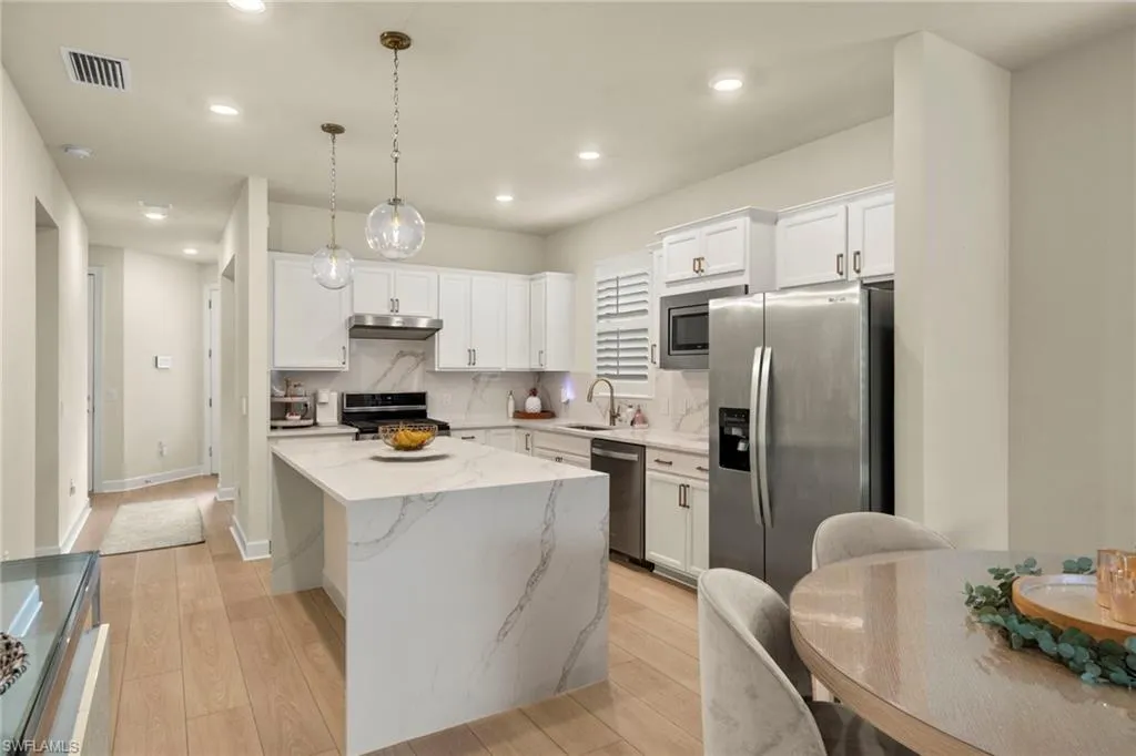 The open-concept layout showcases sleek luxury vinyl plank flooring, 8’ doors, and classic plantation shutters throughout. At the heart of the home, the stunning kitchen shines with quartz countertops, a dramatic waterfall island, and custom cabinetry—perfect for cooking, entertaining, or gathering with friends.