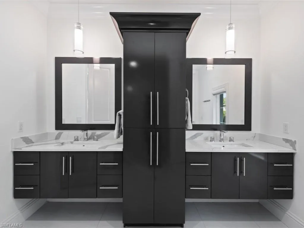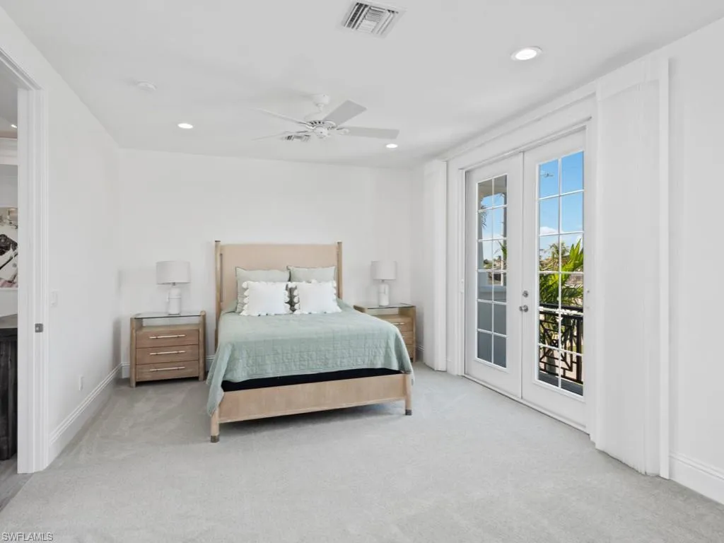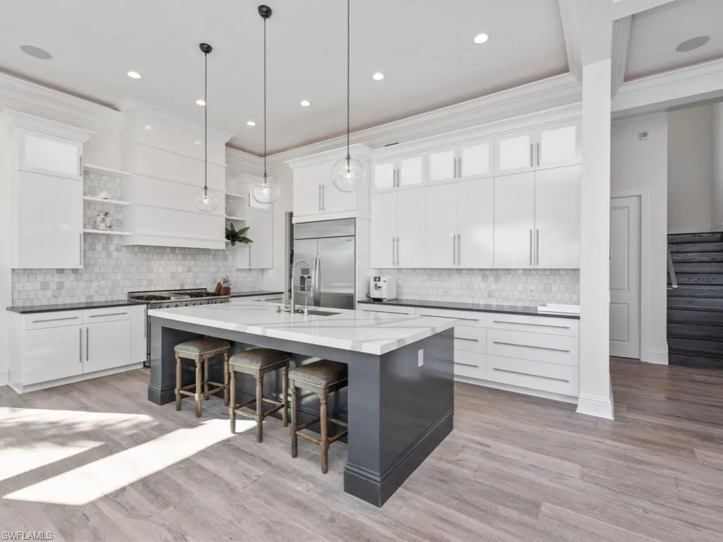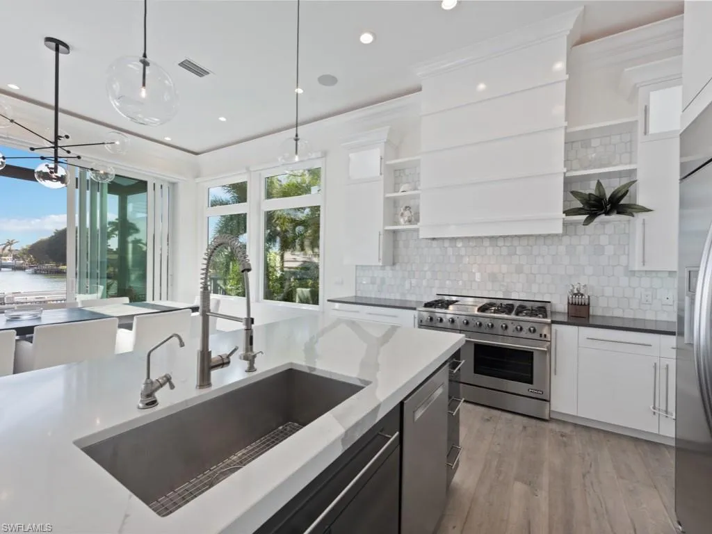 is on the first floor and is steps to your spa and pool with expansive outdoor space and outdoor kitchen. Many upgrades include freshly painted inside and out, all new light fixtures, fenced in backyard, impact resistant doors and windows. Dramatic, open great room with gorgeous water views, perfect for entertaining,