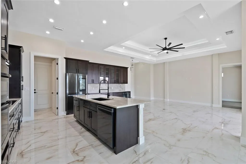 Step inside to discover an open-concept design enhanced by upgraded large-format tile flooring and abundant natural light. The gourmet kitchen is a culinary enthusiast’s dream, boasting rich espresso cabinetry, upgraded countertops, a wine bar, and a smart refrigerator. A spacious island seamlessly transitions to the living and dining areas, making entertaining effortless.