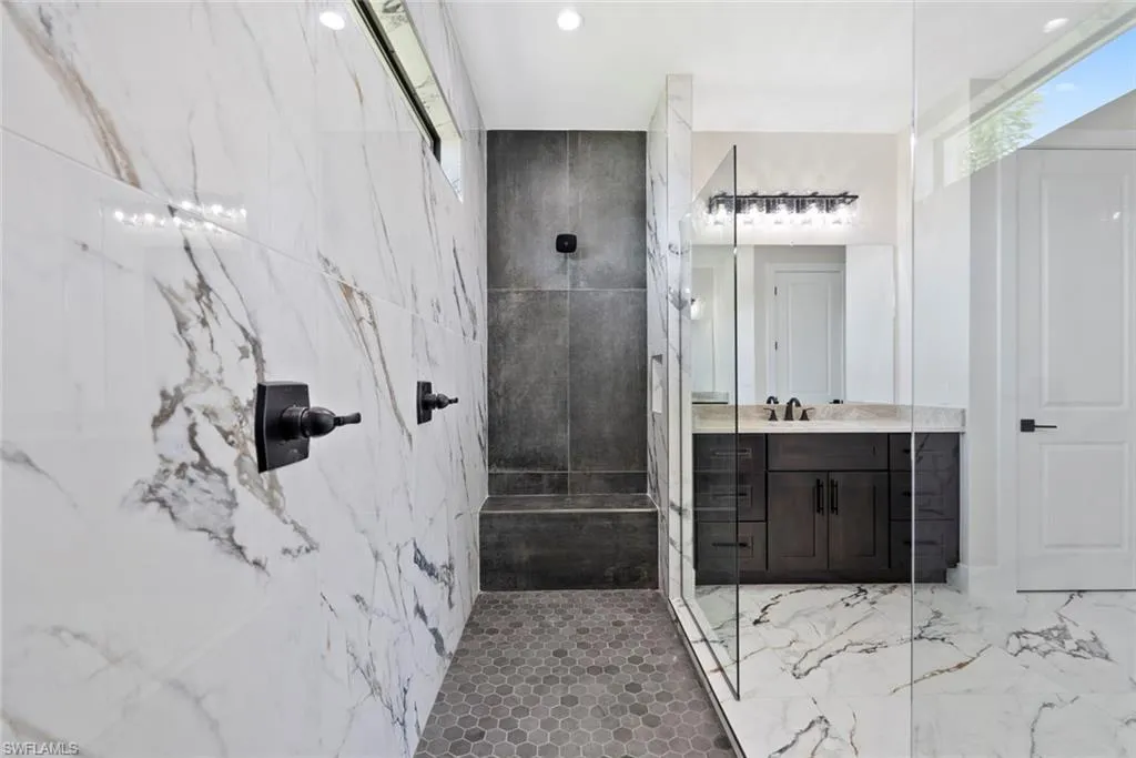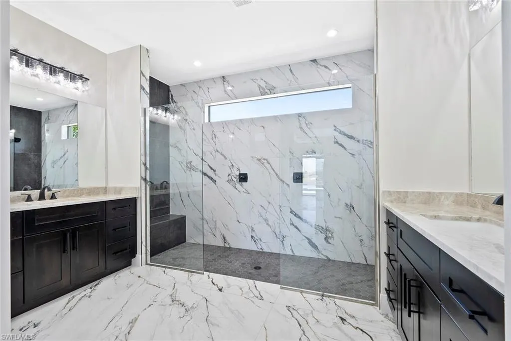 Three sets of sliding glass doors connect indoor living to the oversized extended pool lanai, where you’ll find a custom outdoor kitchen, picture screens, a spa, and a sparkling pool—all perfect for soaking up the Florida sunshine in privacy and style. The master suite is a tranquil haven, featuring two walk-in closets, dual sinks, and an oversized walk-in shower.