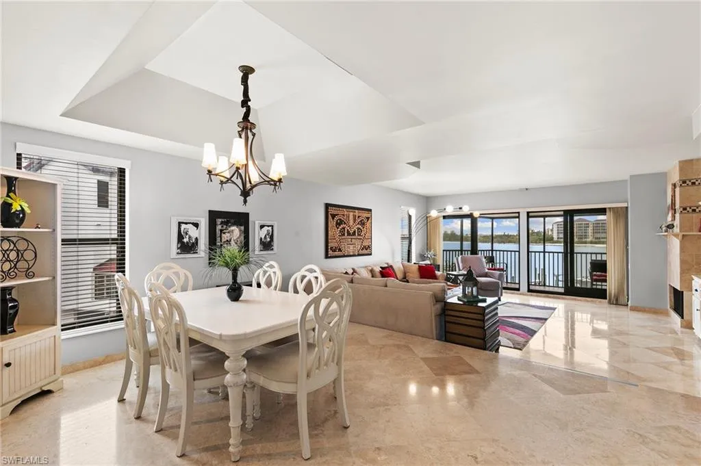 Inside, the layout showcases timeless travertine flooring, a remodeled kitchen with modern cabinetry and lighting, and updated bathrooms with contemporary fixtures. Expansive sliding glass doors fill the home with natural light and lead to a private balcony where you can watch dolphins and boats drift by.