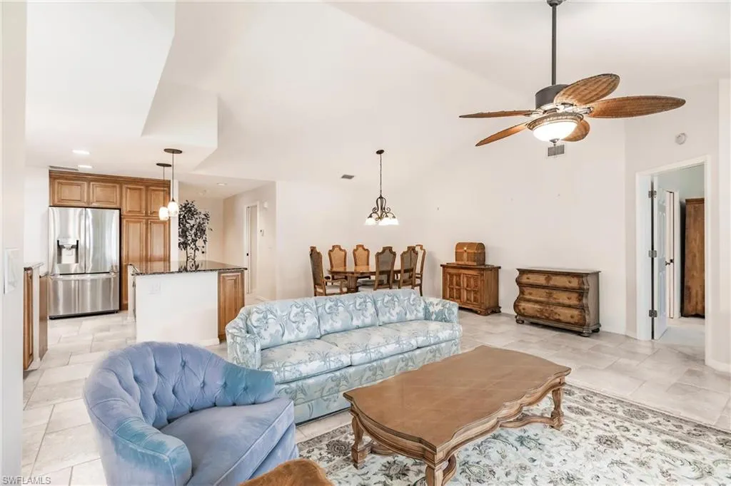 Experience resort-style living in this beautifully maintained second-floor condo, located in the highly sought-after community of The Vines at Estero Country Club. Thoughtfully designed with an open floor plan, this home is filled with natural light, enhanced by soaring vaulted ceilings, recessed lighting and ceiling fans throughout that add both comfort and elegance.