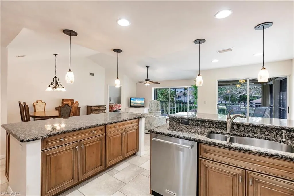 The spacious living area flows seamlessly into a beautiful kitchen, ideal for entertaining. Featuring ample counter space, lots of cabinets, modern appliances, and a welcoming atmosphere, this kitchen is perfect for hosting gatherings or enjoying quiet evenings at home. The updated flooring in the common areas and den adds a modern touch, while the private lanai with ceiling fans offers a peaceful retreat with serene landscape views and electric screened shutters for added comfort.