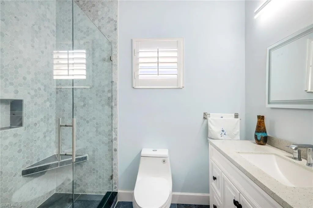 Upon entering, you’ll be greeted by brand-new tile and wood flooring, 5” baseboards throughout, updated LED lighting, and plantation shutters. The luxurious master suite boasts two walk-in closets and a private, newly renovated bath. The home also includes a new AC unit installed in 2024, and all appliances were replaced in 2022, including the washer, dryer, refrigerator, and dishwasher. The guest and master showers are both adorned with elegant marble tile and rainhead shower spouts, further enhancing the home’s refined design. New ceiling fans complement the upgraded décor.