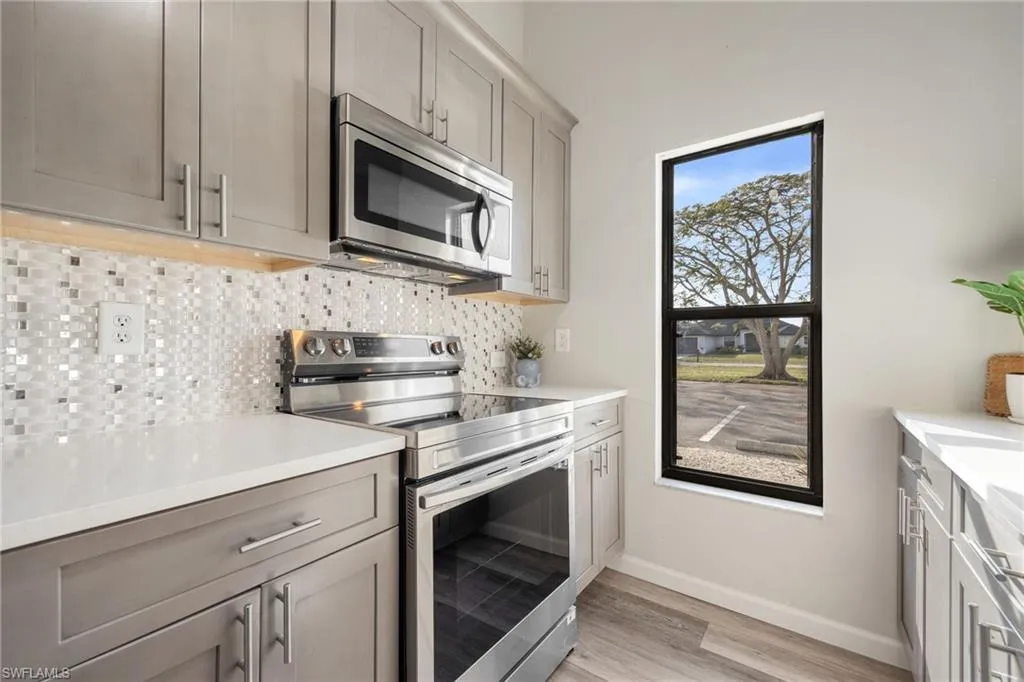 Inside, you’ll find a modern, fully renovated kitchen featuring brand-new wood cabinetry, stunning quartz countertops, and sleek stainless steel appliances. The entire condo boasts new lighting and stylish LVP flooring throughout, providing a fresh and low-maintenance living space.