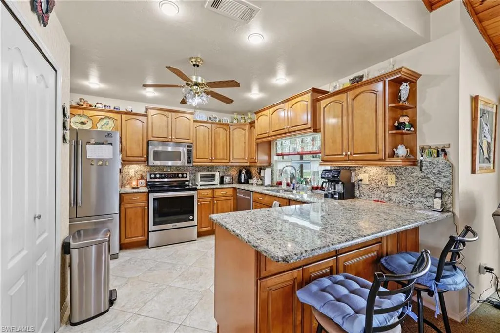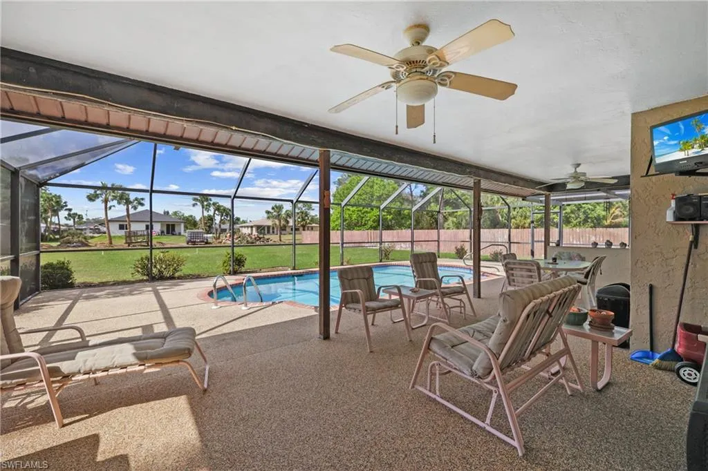 Experience the perfect blend of comfort, space, and outdoor living in this stunning 3-bedroom, 2-bathroom home with a 2-car garage on nearly half an acre in Lehigh Acres. Designed for those who love to entertain or relax in their own private retreat, this home features a sparkling below-ground heated pool with a huge screened-in lanai, offering views of the expansive backyard with endless possibilities. The pool pump was just replaced in 2024, Roof (2018) ensuring years of enjoyment, while triple sliders from the house pocket all the way in, seamlessly blending indoor and outdoor living. Inside, you’ll find a thoughtfully updated home with modern conveniences, including a brand-new A/C unit (2024) and a water heater under two years old. The kitchen is a chef’s delight, featuring Maytag appliances purchased in 2022, an updated faucet, and a pantry for extra storage. The home also includes impact-resistant windows and doors for peace of mind. The front entry welcomes you with tiled flooring, a convenient coat closet, and a beautiful wood ceiling. The spacious master suite features a walk-in closet and sliding door access to the lanai and pool area. In contrast, the en-suite master bath includes a walk-in shower, Corian countertop, linen closet, and durable vinyl tile flooring. The guest bath offers a shower/tub combo with matching vinyl tile flooring. Both bathrooms are equipped with new handicap toilets for added accessibility. Practical features continue throughout the home, including a laundry area with a tub in the garage, where the washer and dryer will stay. The garage also features a screen for added ventilation. Outside, the property is equipped with gutters, an automatic sprinkler system running on well water, while the rest of the home is connected to central water. A spacious shed or mini barn on the property provides additional storage, and the oversized lot offers plenty of room to create your dream outdoor space. With its move-in-ready condition, premium upgrades, and an unbeatable outdoor oasis, this home is a rare find. Schedule your showing today and make it yours! (Lehigh is located at the highest elevation in Lee County.) No FLOOD insurance is required.