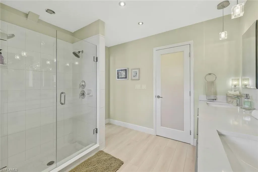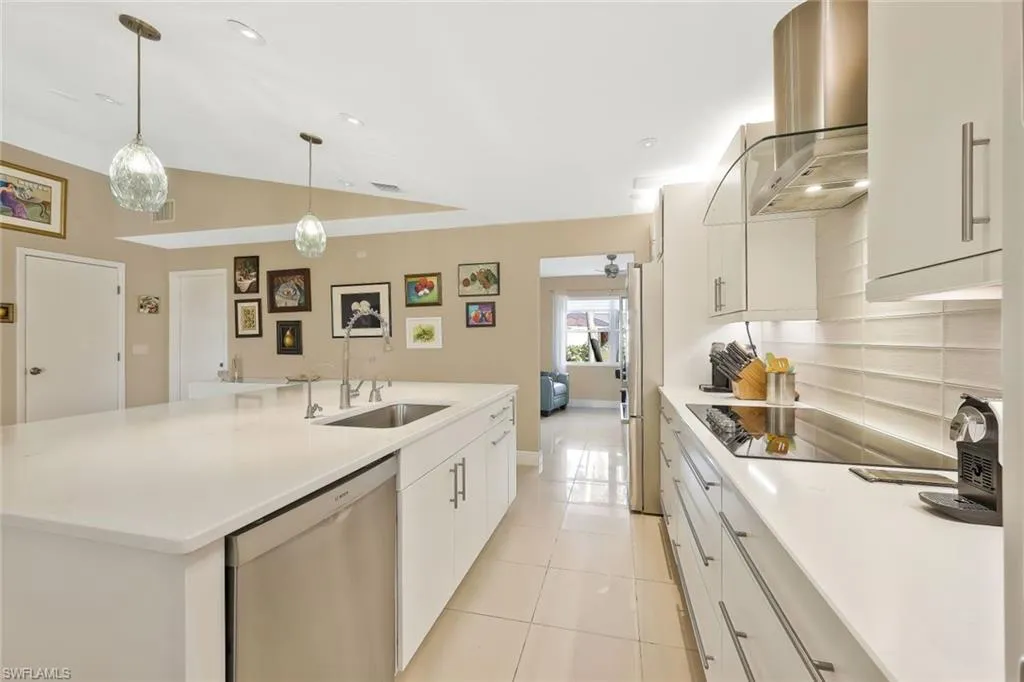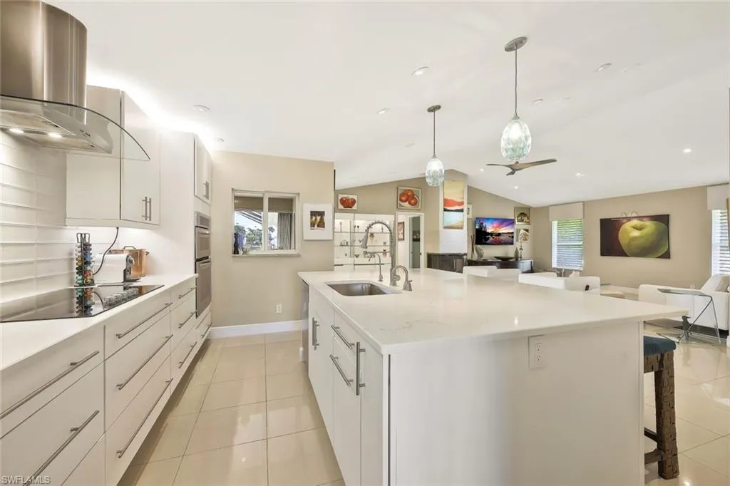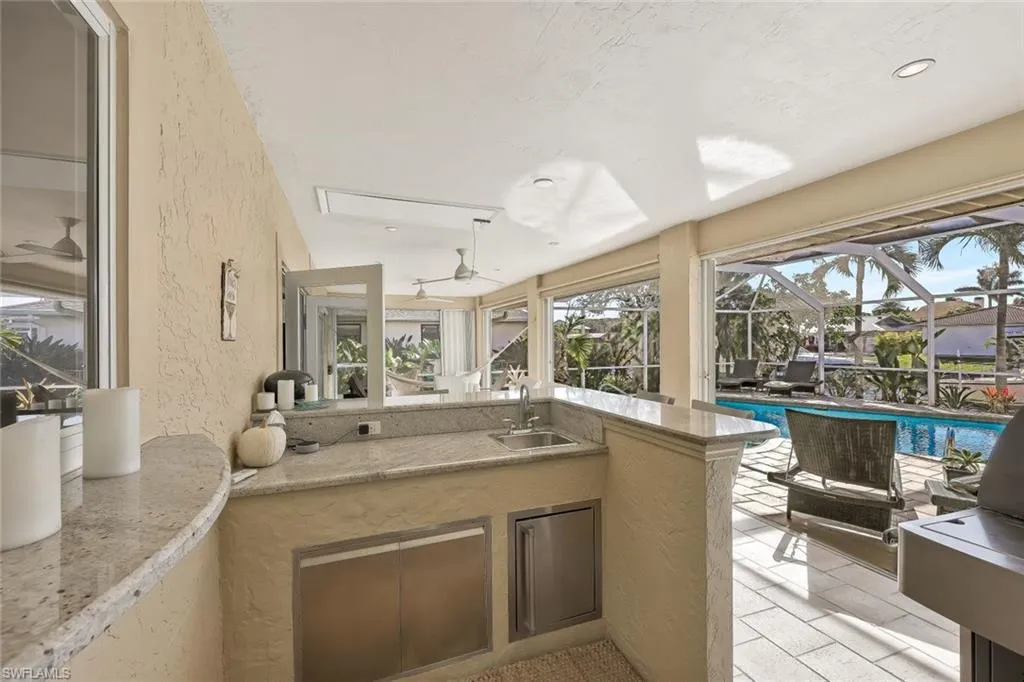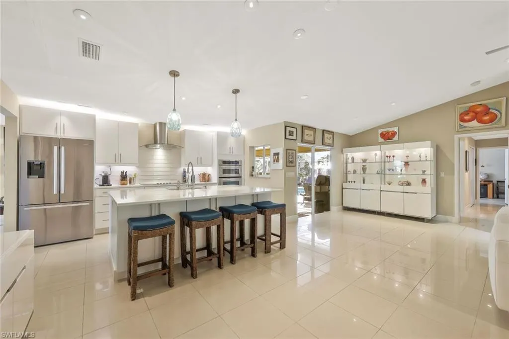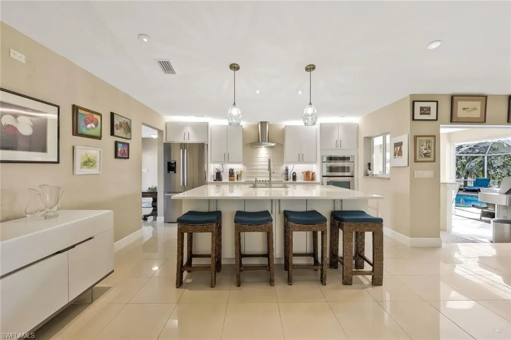 Kitchen is a chef’s dream with quartz tops, center island with seating, subway tile backsplash, all part of the greatroom design. Greatroom has wood buring fireplace. soaring ceilings, sliders to pool deck and outside wet bar with granite top and seating. Large lanai has large pool with spa, pavers, manual hurricane shutters. Stepping onto the dock: both Captain’s walk around docks offer TWO Boat lifts(8000# and 12000#) made of composite material for longevity.