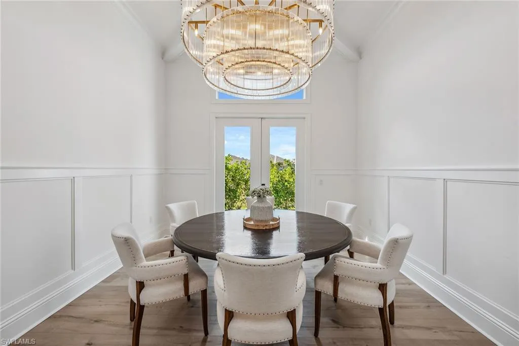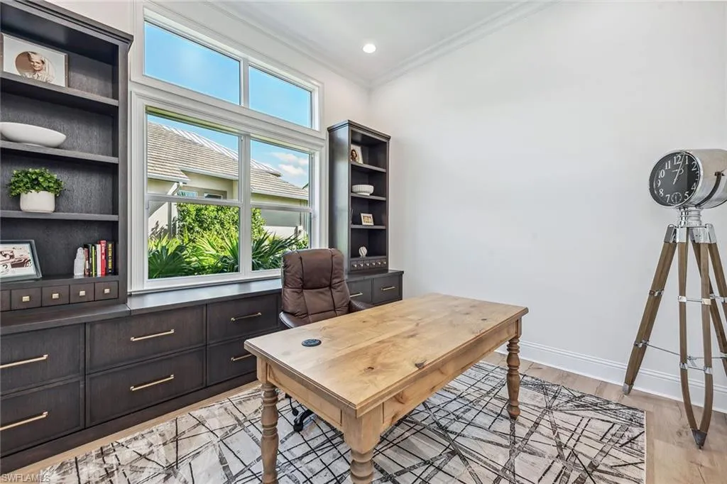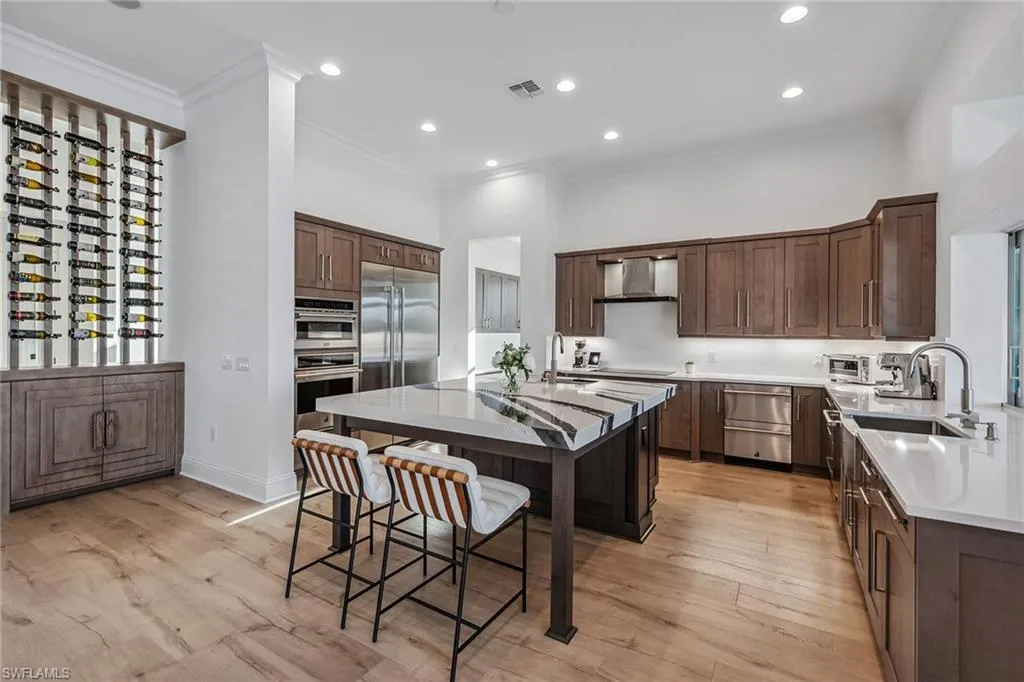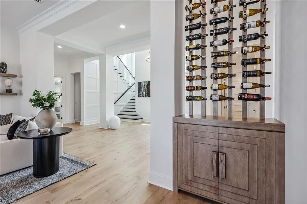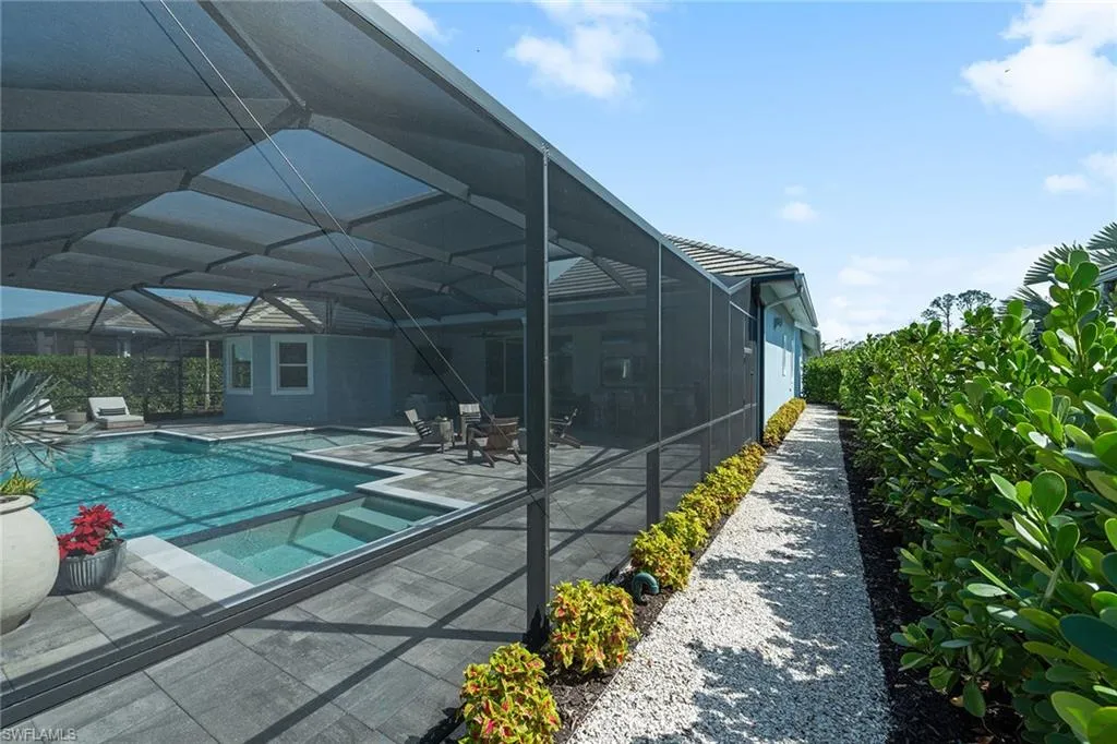 In the desirable Isles of Collier Preserve, this extraordinary estate home offers the rare opportunity to own possibly the finest residence in the community! Set on a sprawling half-acre, this fully furnished four-bedroom plus office and loft, seven-bath luxury home is set on a natural river with sunset views and a spectacular lanai, making it a retreat for nature lovers and refined living. Upon arrival, the paver driveway and beautiful landscaping set the stage for the grandeur that awaits. The double-door entry welcomes you to a 4,284 square-foot two-story home filled with sunlight, soaring ceilings with crown moldings and exquisite architectural details. Wood flooring flows seamlessly throughout, adding warmth and sophistication to the home’s organic, modern elegance. The impressive great room has impeccable high-quality built-ins and a custom floor-to-ceiling 80-bottle wine cabinet, creating a refined atmosphere. Your dining room with a side patio glows under an opulent chandelier, surrounded by classical wainscotting. Designed for the culinary enthusiast, the kitchen features quartz counters, large island, induction cooktop, wall oven, premium stainless appliances and two beverage drawers. Under-cabinet lighting enhances the space, while a walk-in pantry with desk offers added convenience. Working from home is a pleasure in the home office with premium built-ins and custom brass hardware. The first-floor primary retreat features tray ceilings with views of the pool, river and huge backyard. Custom walk-in closets with floor-to-ceiling built-ins provide ample storage, while the spa-like en suite flaunts a double sink vanity and twin showers. Your fully furnished terrace is an entertainer’s dream with an extra-large saltwater pool and spa, cabana bath, large granite kitchen with gas and infrared burners, grand vent hood, side burner for seafood boils, and a bartending station with built-in blender, mini refrigerator and ice maker. The panoramic screened enclosure with a SWAT mosquito system allows for year-round enjoyment, while the patio with a beautiful Cypress wood ceiling provides for alfresco dining. Notables include impact glass, new first-floor air conditioner, security cameras throughout the property and single garage converted into a gym with air conditioning, mirror and rubber flooring. Highlights include a large upstairs loft with built-in cabinetry and a screened balcony to enjoy beautiful sunset views, Sonos system, large built-in safe and ample storage throughout the house. The exceptional home site offers back lawn fishing, programmable multicolor landscape lighting and beautiful shell paths. This home resides in a renowned, nature-inspired gated community with eight miles of hiking trails, kayaking, a waterfront restaurant, fitness center, tennis, pickleball and more. Only minutes from Old Naples pristine beaches, restaurants, yacht clubs and boutique shopping, this home offers a harmonious blend of serenity and sophistication.