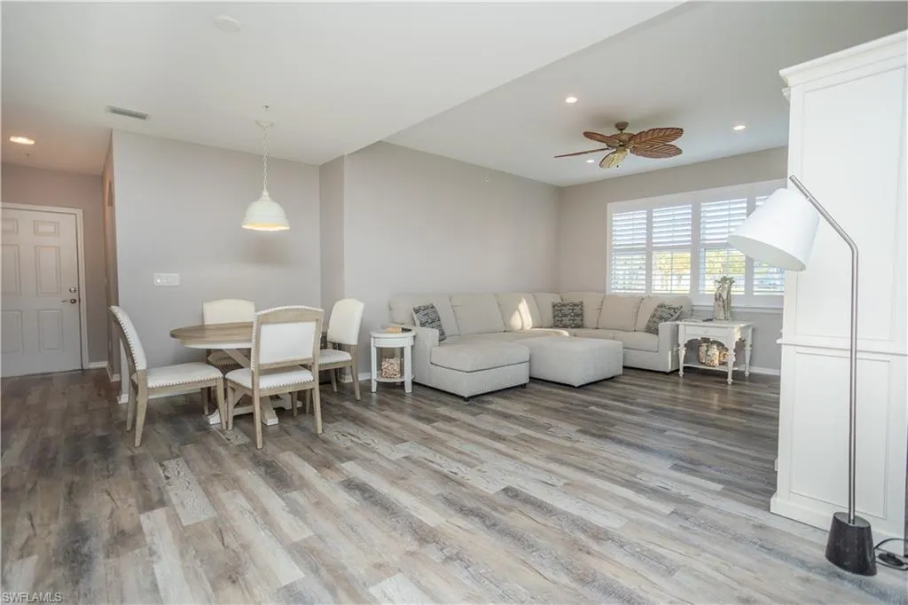 Key highlights include luxury vinyl plank flooring throughout, plantation shutters, 42″ wood cabinetry with under-cabinet lighting, and stainless steel appliances. The spacious kitchen boasts a large counter-height island, granite countertops, and a beautiful tile backsplash. Every fan and light fixture has been upgraded. This immaculately well kept condo has a fresh, modern feel.
