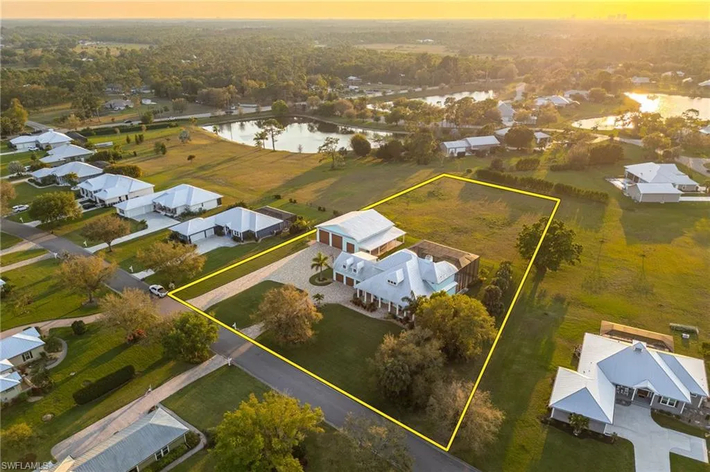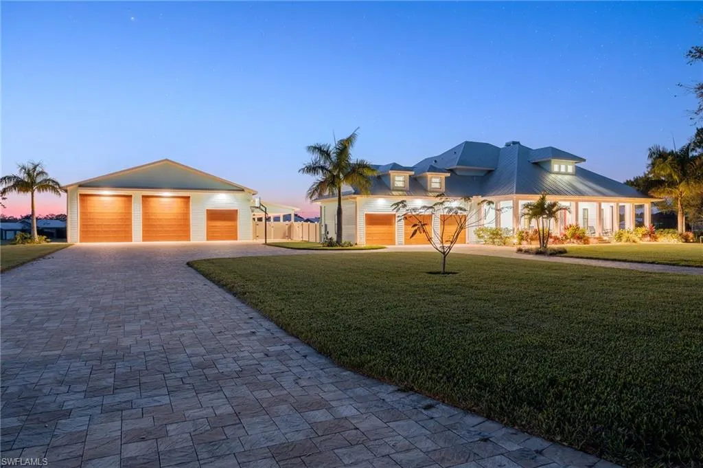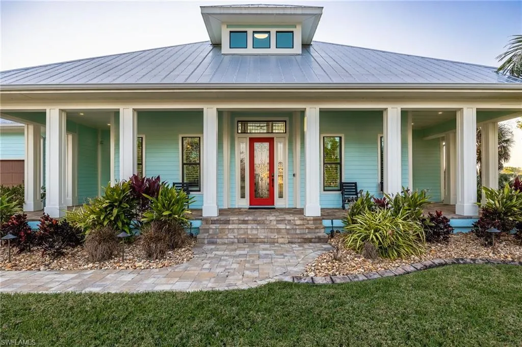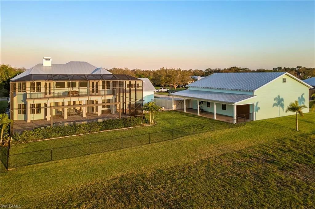 Nestled within the exclusive Horse Creek community, this custom-built estate offers an unparalleled blend of luxury, space, and artistic design. Set on 2.23 acres, this 3-bedroom + flex room, 3.5-bathroom home spans 4,200+ sq. ft., boasting exquisite craftsmanship, and high-end finishes. Sitting along the Orange River, residents enjoy kayak storage, peaceful water views, and a connection to Florida’s natural beauty. With estate-sized home sites rare in Southwest Florida, this property stands apart as a true sanctuary of elegance and privacy. From the moment you arrive, the home’s Tame Teal exterior and classic Hardie board siding exude charm, perfectly complementing its Old Florida architectural style. Inside, a carefully curated color palette enhances the light-filled spaces—Embellished Blue in the main living areas, Beach Dune for a serene touch, and Hearts of Palm green in the dining room and half bath for a refreshing contrast. The soaring coffered ceilings and open floor plan create a seamless flow, perfect for both everyday living and entertaining. The living room’s showpiece is a custom, hand-crafted Pewabic Pottery fireplace, designed by the historic Detroit ceramics studio founded in 1903. This rare and stunning feature is a testament to the artistry woven throughout the home. The spacious kitchen is a work of art in itself, featuring GE Café appliances, a reverse osmosis system, and a striking handmade aquamarine ceramic tile backsplash from Soho Studio in New York. Custom cabinetry, high-end finishes, and an oversized island make this space both functional and visually stunning. The primary suite is a private retreat, complete with an ensuite laundry area in the master closet, providing ultimate convenience. The additional bedrooms and flex room offer versatility for a home office, gym, or guest accommodations. Step outside to your screened-in pool and spa, where you’ll enjoy breathtaking western exposure sunsets. The expansive patio and fire pit area offer the perfect setting for entertaining or unwinding under the stars. Car enthusiasts, hobbyists, toy collectors and adventurers will love the garage and outbuilding spaces: 3 attached garage spaces, 2,704 sq. ft. detached garage/outbuilding with 50-amp service, water, and sewer, RV/Boat storage with two 14×14 doors and one 10×10 door. This estate is truly one-of-a-kind, combining luxury, artistry, and functionality in one of Southwest Florida’s most desirable communities.