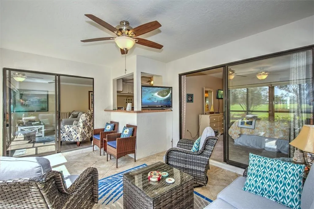 Step outside your front door and there is the putting range and you have your own golf cart.THERE IS A BRAND NEW AIR CONDITIONER. The water heater was replaced in 2021. The Lanai is perfect for watching the golfers stroll by while playing. This condo is sold Turnkey with very nice furnishing.
