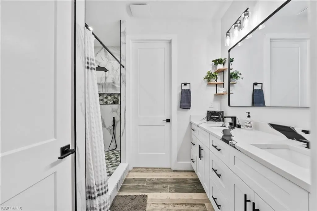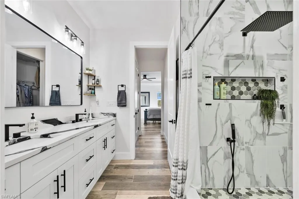 Step inside to discover luxury finishes throughout. The chef’s kitchen steals the show with a massive 13-ft island, level 5 quartz countertops, custom wood cabinetry, and two oversized pantry closets with slide-out shelving for easy access. The open floor-plan is tied together with elegant wood-grain tile floors, 8-ft shaker-style doors, and energy-saving open-cell foam attic insulation beneath a 2-year-old roof.
