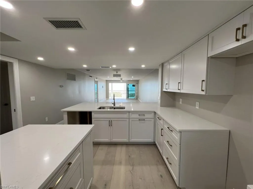 Discover unparalleled beachfront living at Sunward of Sanibel, an intimate and upscale complex of just eight residences along prestigious West Gulf Drive. This refined 2-bedroom, 2-bathroom condo offers unobstructed Gulfview and a seamless blend of coastal elegance and modern comfort. Designed in collaboration with the Sanibel Design Center, this residence showcases a sophisticated coastal modern aesthetic. The kitchen and bathrooms feature Omega Pearl cabinetry, Quartz Pompeii White Mountain countertops, and polished chrome EMTEK hardware. Engineered wood flooring flows throughout, with designer tile in the bathrooms, creating a timeless and luxurious ambiance. Thoughtfully placed pin lighting enhances the warm and inviting atmosphere. The expansive open kitchen is perfect for entertaining, complete with a breakfast bar, pantry, and in-unit laundry. The Gulf-facing primary suite opens onto a shared lanai with the living area—ideal for soaking in breathtaking sunsets. The spa-like ensuite bath includes a walk-in shower, water closet, double-sink vanity, and spacious walk-in closet. Designed for both luxury and convenience, this residence includes covered parking, generous interior and exterior storage, and individual EV charging ports. Outfitted with new impact glass, hurricane shades, and HVAC, this condo offers peace of mind for effortless island living. A rare opportunity to own in one of Sanibel’s most exclusive beachfront enclaves—don’t miss this chance to experience Gulf-front luxury at its finest.