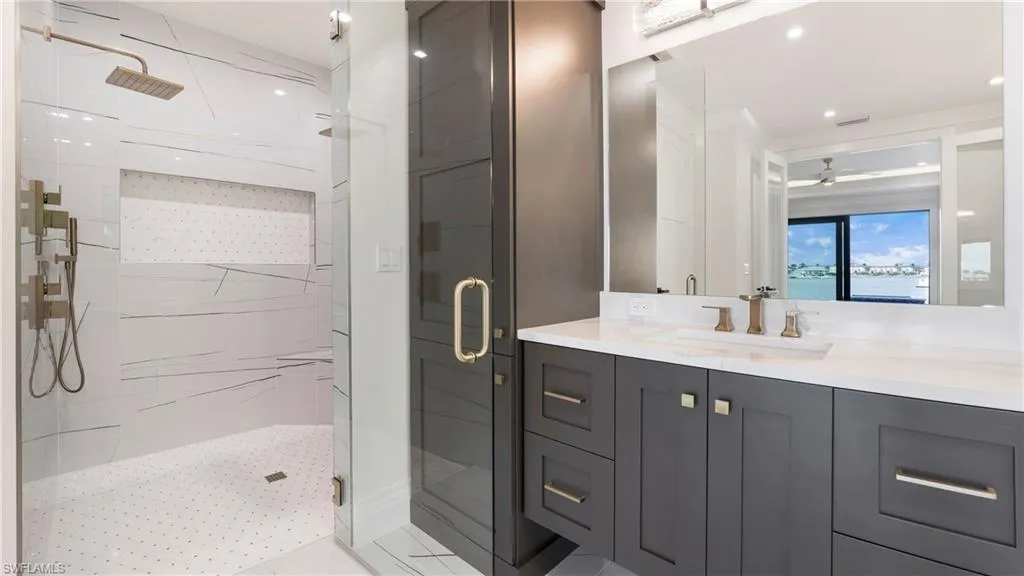 Luxurious Coastal Paradise with Breathtaking Views! Just Completed! This incredible 4 bedroom plus office, 4 bathroom, direct Gulf access, coastal contemporary home leaves nothing to be desired. The entry foyer opens to a huge great room with 12’ custom ceilings and 10’ tall sliders and windows that provide an abundance of natural light, while offering amazing views of Smokehouse Bay. The kitchen, complete with Amish-built custom cabinetry, quartz and quartzite countertops, premium Thermador appliances, walk-in butler’s pantry, and large island, overlooks the morning room and stunning water views. The master suite, located on the 1st floor, has an 11’ ceiling, two walk-in closets, separate vanities, oversized shower, and a soaking tub. Access the outdoor covered and screened lanai from the master suite, pool bath, great room, or morning room and enjoy the built-in fireplace, electric shades, custom outdoor kitchen, pool with integrated waterfall spa, and sun deck. The breathtaking views continue upstairs with the 2nd floor featuring another great room, complete with a wet bar, 2 bedrooms, each with walk-in closets and a Jack and Jill bathroom, and a 4th bedroom with en suite bathroom. The oversized upstairs lanai provides picturesque panoramic views of the Esplanade and Smokehouse Bay, leading out to the Gulf. This masterpiece includes a 1000-gallon propane tank, 22kW Generac generator, engineered hardwood and custom tile throughout, designer fans and light fixtures, crown molding, shiplap, central vacuum, and much more. The 4-car garage offers architectural glass doors and includes a passthrough garage that is over 40’ deep with rear garage door for quick access to your future dock. This magnificent beach house is centrally located and is just minutes to the white sand beaches of Marco Island, parks, tennis and pickle ball courts, golf, shopping, dining, schools, and the YMCA. Don’t miss the opportunity to enjoy the best of what Marco Island has to offer!