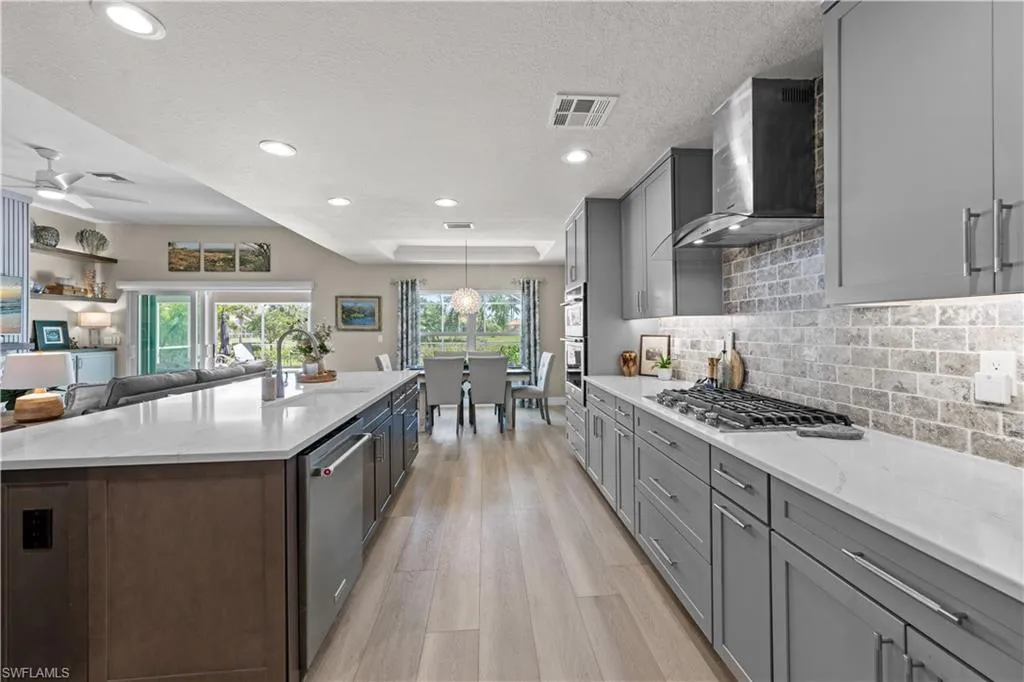 Welcome to 9063 Astonia Way in The Reserve at Estero—a newly renovated, meticulously maintained residence that lives like a model home, unlike any other in the community. This 4-bedroom, 2.5-bath home offers a thoughtful layout with a first-floor master suite, a dedicated office/hobby space, and a versatile loft, combining custom luxury with everyday functionality. Inside, you’ll find a completely reimagined interior featuring IMPACT-RESISTANT WINDOWS, fresh paint, and new flooring throughout. The heart of the home is a professionally designed custom kitchen, beautifully outfitted with all-new KitchenAid appliances, sleek cabinetry, and stylish finishes, while the renovated laundry room adds function and ease with built-in storage and a second refrigerator for convenience. The custom office/hobby space provides the ideal setting for productivity or creativity, and the living area is anchored by a fireplace with a handcrafted mantle and built-in shelving, adjacent to a dry bar with custom cabinetry and backsplash—perfect for entertaining. The FIRST-FLOOR master suite is a true retreat with private access to the lanai, dual vanities, spacious closets, and a large walk-in shower. Upstairs, three generously sized bedrooms and a flexible loft area offer endless possibilities for relaxation, recreation, or additional workspace. Step outside to your private outdoor oasis featuring a covered lanai, custom outdoor kitchen with grill and refrigerator, and a sparkling saltwater pool overlooking the serene water view. The pool is heated by a BRAND-NEW natural gas Pentair Bluetooth heater, a premium system that ensures year-round enjoyment. The tranquil setting is enhanced by lush, mature landscaping and upgraded landscape lighting, creating an inviting ambiance both day and night. Additional upgrades include a WHOLE-HOUSE NATURAL GAS GENERATOR and two newer A/C units (2019), all situated in Flood Zone X. Located in The Reserve at Estero, a guarded, gated community WEST of 75 with resort-style amenities including an updated clubhouse, fitness center, tennis courts, pool, and playground. Prime location between Naples and Fort Myers, close to Coconut Point Mall, RSW Airport, FGCU, top-rated golf courses, and the beautiful Gulf beaches.