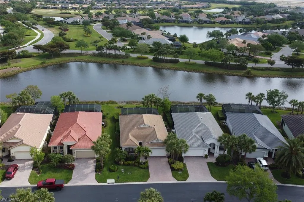 Three bedrooms and two baths on a quiet street location with excellent water views beyond your recently retiled and refurbished in ground pool. New roof and air conditioner in 2023. Tile throughout the living areas and baths and new carpeting in the bedrooms. Relax on your covered lanai and enjoy the beautiful views of the lanai pool and lake. Disappearing doors in the family room make the home feel even bigger. Home is being sold furnished including televisions! New washer and dryer stay. Epoxy floors in your two car attached garage with new storage racks. Crown molding throughout the home. Eastern exposure for beautiful sunrise views, and cooler afternoons by the pool. Owners have a transferable flood policy. Verandah has two golf courses and no waitlist. Or join as a social member and enjoy 7 months of golf (just pay the reduced greens fees), with free use of kayaks, lighted tennis, bocce, and pickleball courts, water aerobics, a lap pool, fully equipped gym with spin and other classes , plus miles of walking and biking trails. No minimums in choice of three restaurant locations. WIFI DVR and cable all included in your HOA dues. Nearby shopping and restaurants can be accessed by golf cart.