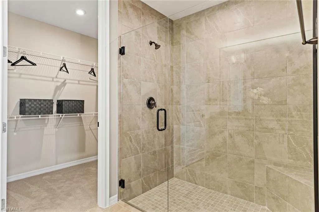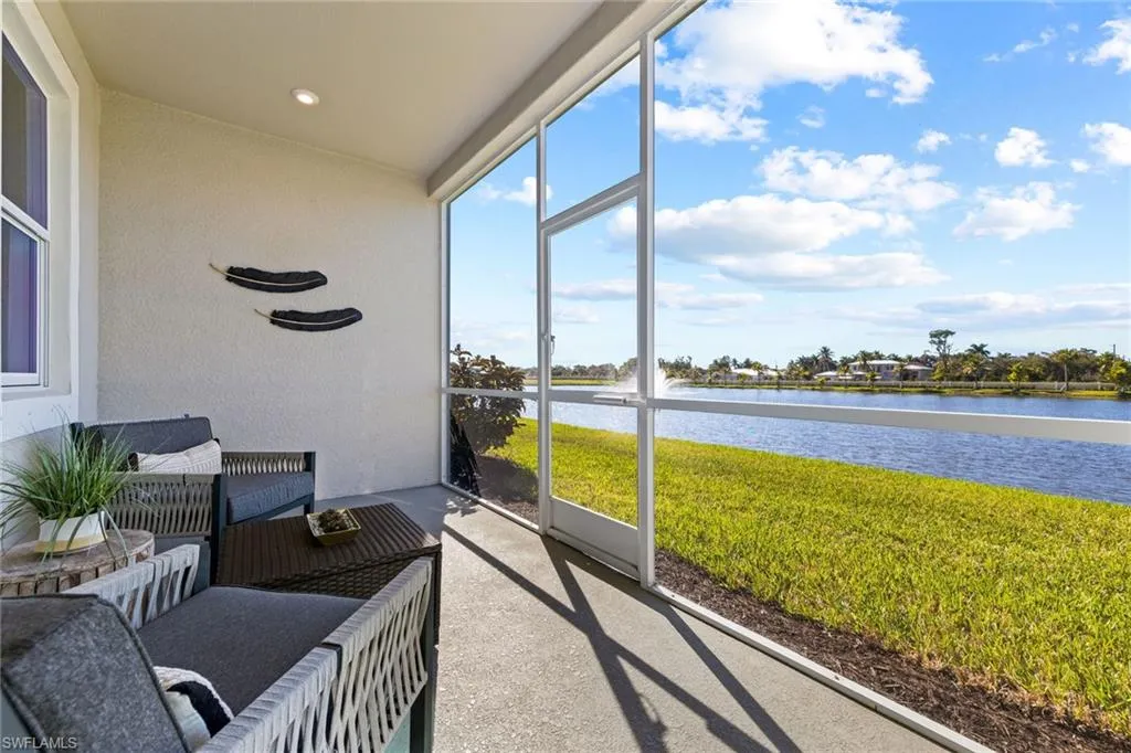 MODEL AVAILABLE! Amazing water lot and close proximity to the amenities, this is one you don’t want to miss — The Delmar coach home is a 1st floor center unit (1,346 sq ft under air) home designed to enhance your lifestyle. Featuring Smart Home Technology, 2 bedrooms, 2 baths, and a 1-car garage, upgraded design package, this open and airy flloor-plan has a natural flow that lives like a single family home. A beautiful designer kitchen with 42″ upper wood painted cabinets in Silk, Creama Pearl granite counter tops, large island with room for 5. Design touches such as the Island is wrapped in wainscotting, pantry has glass light doors, and a unique tile backsplash.. The kitchen overlooks the airy Great Room that is highlighted by expansive sliding glass doors that lead to the covered, screened lanai. The owner’s suite is spacious and has 3 large windows that span the back wall for an enourmous amount of natural sunlight. There is a wall feature that includes a modern wallpaper swath bordered by a wood trim. The private owner’s bath includes a dual sink vanity with vanity to celing mirror and light fixtures that have 3 sconces each, large shower with seamless glass enclosure, linen and walk-in closet. The guest bedroom is adjacent to the 2nd full bath and away from the primary bedroom providing privacy to both. The main living area flooring is sizable 6×36 tile in Mocha that compliments the wall color, making it an easy space to decorate. LED lighting fills the kitchen and Great Room, designer chosen fixtures in baths. The screened lanai has space for seating area and table. This makes a great space to enjoy the wonderful Naples weather with a fresh cup of coffee in the am or a relaxing beverage in the evening. Great proximity to shopping centers, restaurants, recreational facilities, beaches, and schools. Pricing, dimensions and features can change at any time without notice or obligation. Photos, renderings and plans are for illustrative purposes only, and should never be relied upon and may vary from the actual home. The photos are from the furnished model home offered for sale.