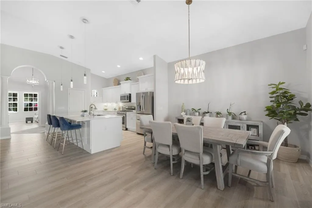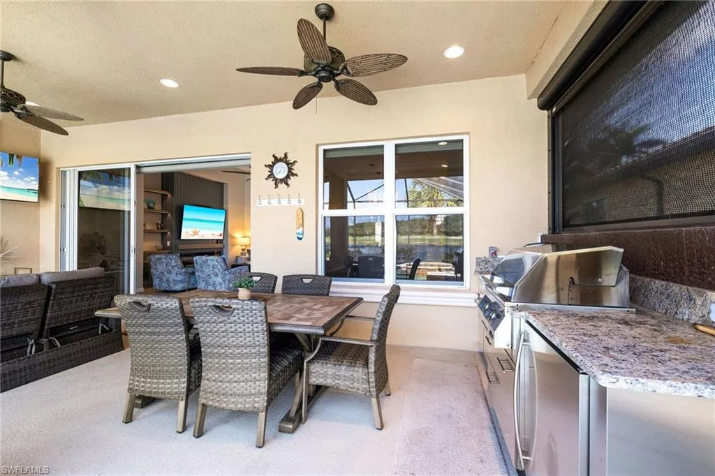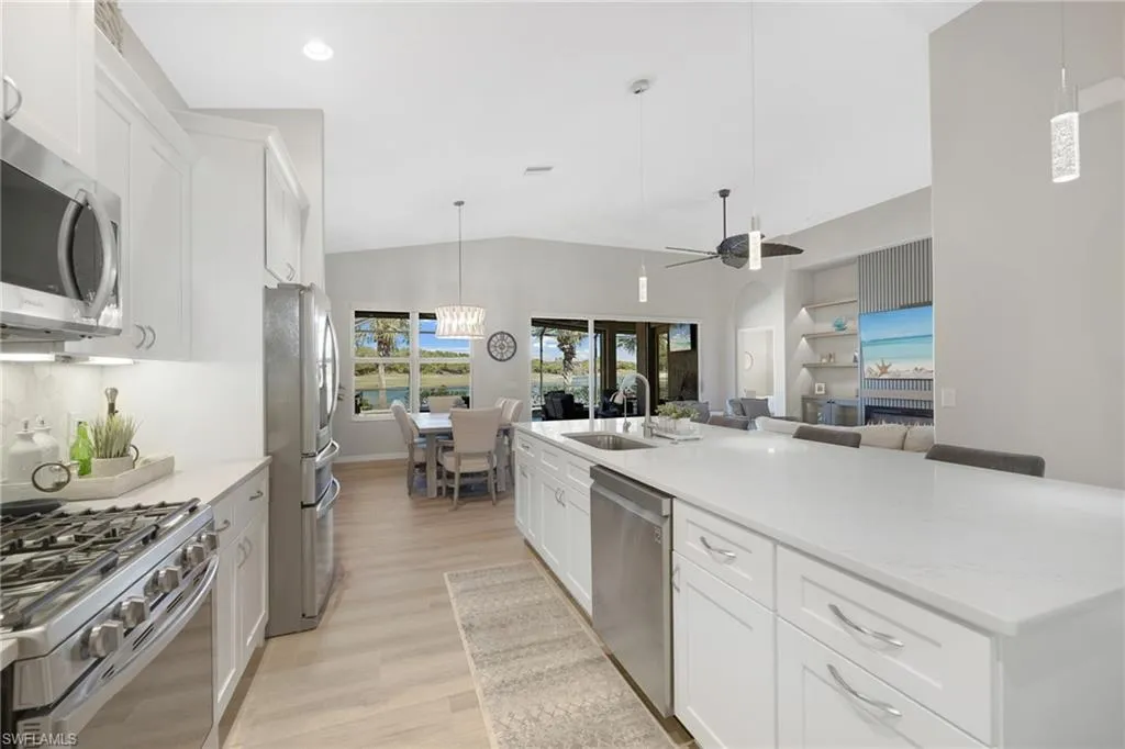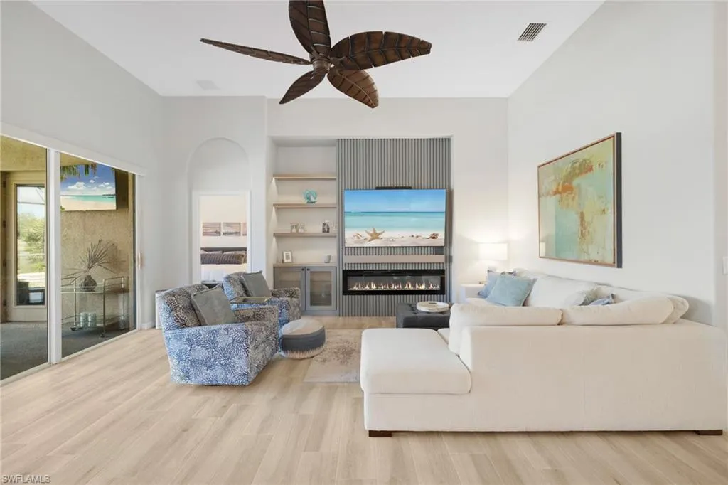 This beautifully updated 3-bedroom, 2.5-bath residence combines modern finishes, open living spaces, and captivating lake and golf course views. The bright, airy interior flows seamlessly to an expansive lanai with outdoor kitchen, saltwater pool, and spa—perfect for relaxing or entertaining with sunset backdrops.