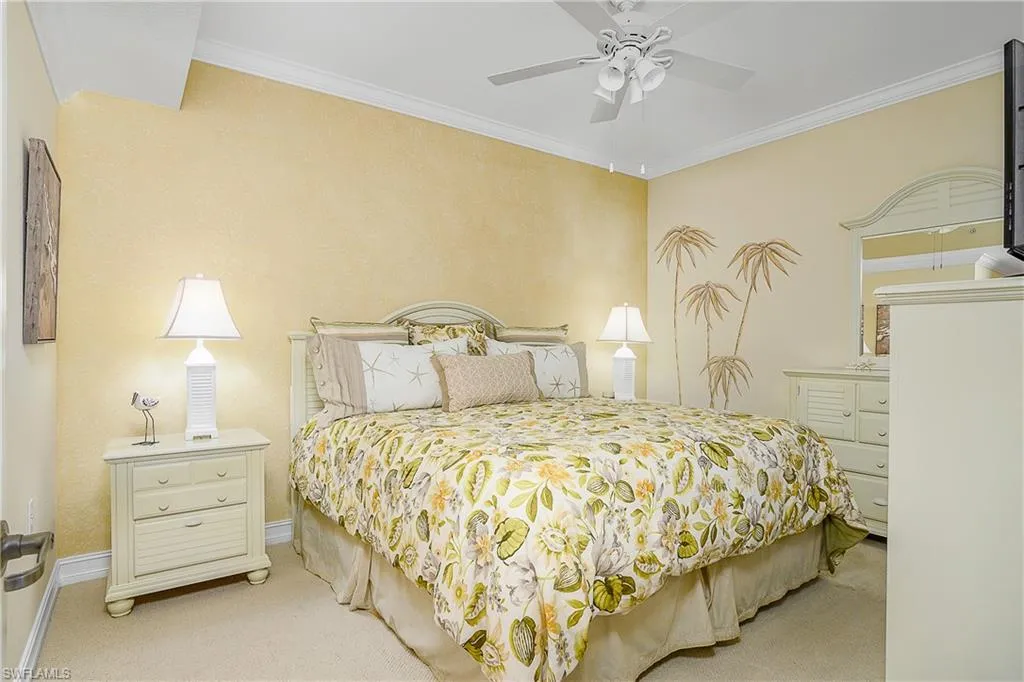 Enjoy morning coffee or evening cocktails on the screened, tiled lanai while soaking in the scenery. Inside, the bright, open floor plan is enhanced with white kitchen cabinets, crown molding, oversized baseboards, upgraded bedroom carpets, designer lighting, and stylish window treatments. Recent upgrades include a brand-new AC and water heater (2024) for worry-free living.