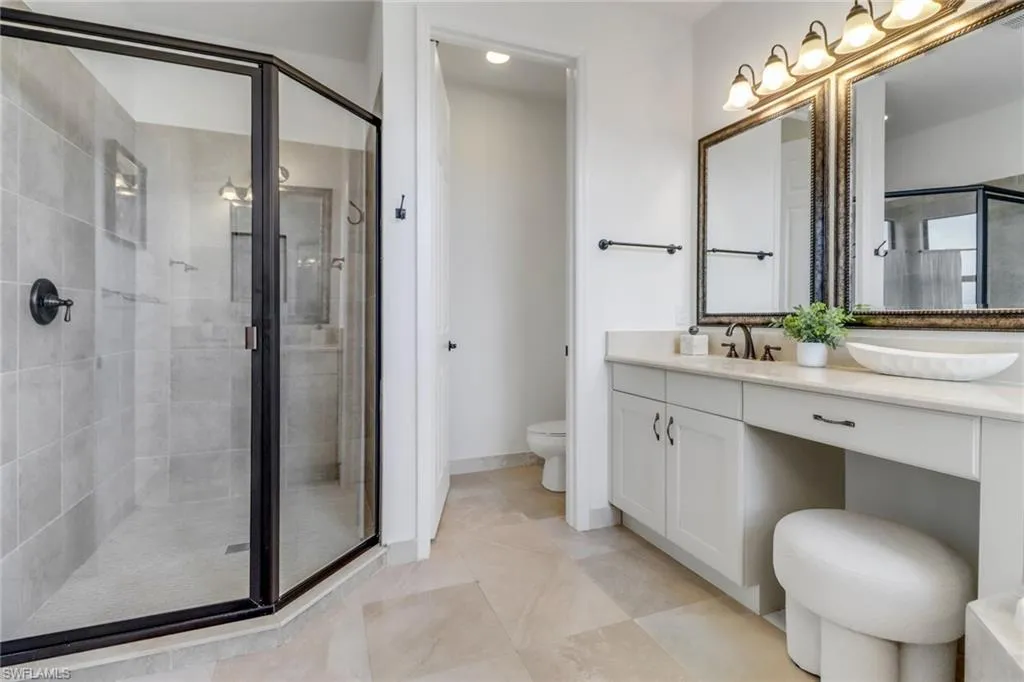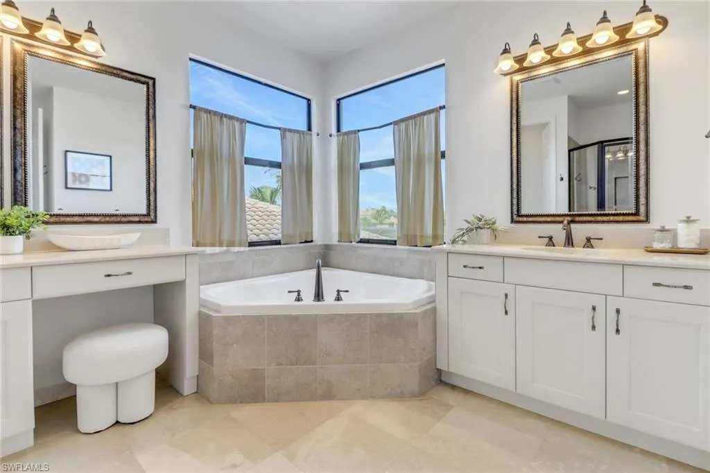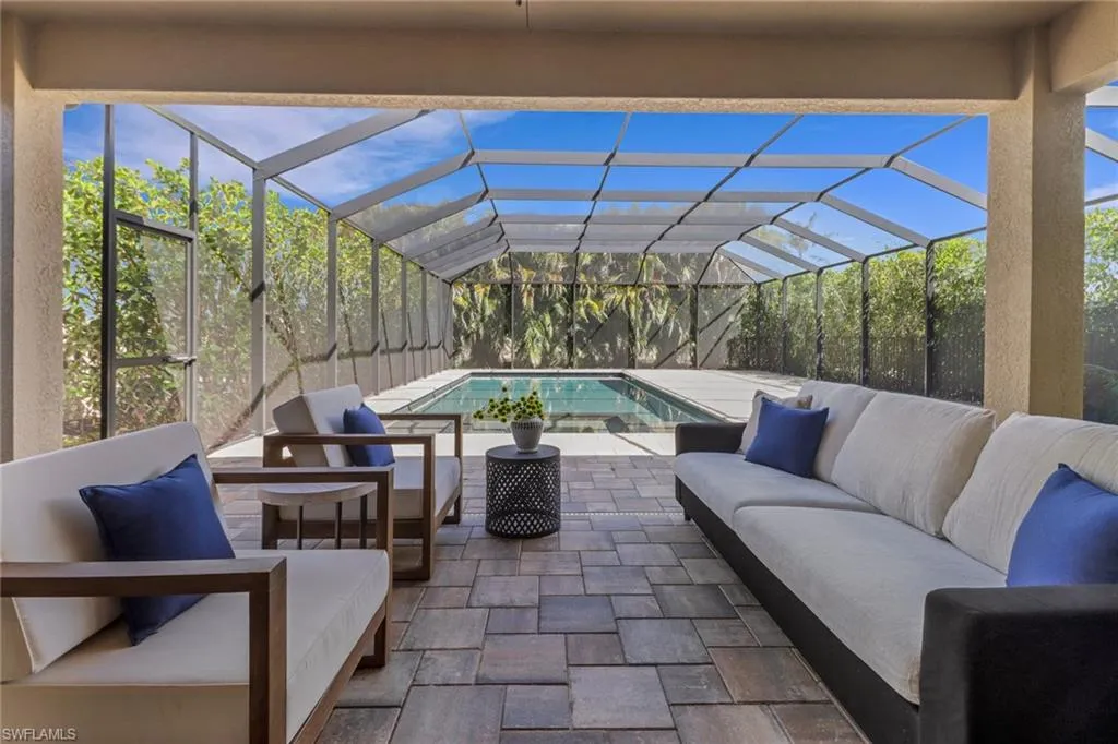 Welcome to this stunning 5-bedroom, 4-bathroom plus den home located in the luxurious gated enclave of Marbella Isles. Thoughtfully designed with both comfort and elegance in mind, this spacious two-story home boasts an open floorplan, wide-plank wood flooring, and crown molding throughout the first floor, creating a warm and inviting atmosphere. A bedroom and full bathroom are conveniently located on the first floor, providing flexibility for modern living. The heart of the home is the beautifully appointed kitchen, featuring custom white cabinetry, granite countertops, stainless steel appliances, and ample storage for all your culinary needs. Upstairs, a versatile flex space offers endless possibilities – it’s perfect as a game room, library, or home office. The primary suite is a true retreat, complete with a tray ceiling, walk-in closet with custom built-ins, and a luxurious ensuite bath featuring dual sinks, a large corner soaking tub, and an oversized glass-enclosed shower. Sliding glass doors from the main living area open to a serene caged lanai, where a sparkling saltwater pool and integrated spa are surrounded by mature landscaping for ultimate privacy – ideal for relaxing or entertaining. Marbella Isles is known for its exceptional amenities, including a clubhouse with a full-sized indoor basketball court, game rooms, fitness center, and community spaces for social gatherings. Outdoors, residents enjoy tennis courts, pickleball, and a resort-style pool with a water play area. Ideally located in the heart of Naples, this home offers easy access to world-class dining, shopping, golf courses, entertainment, and the white-sand beaches. This is Florida living at its finest.