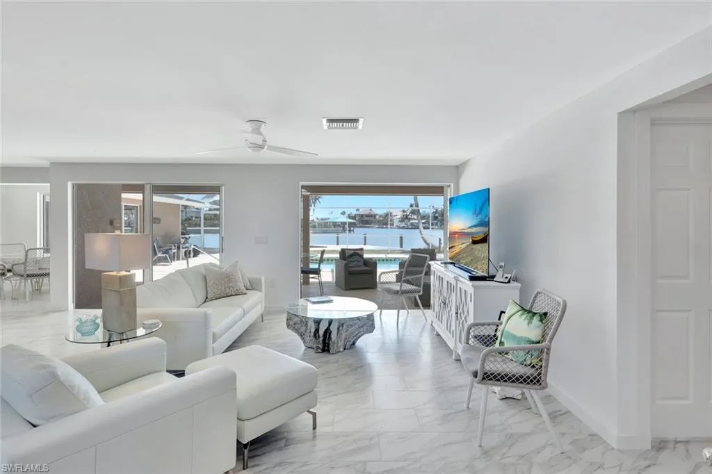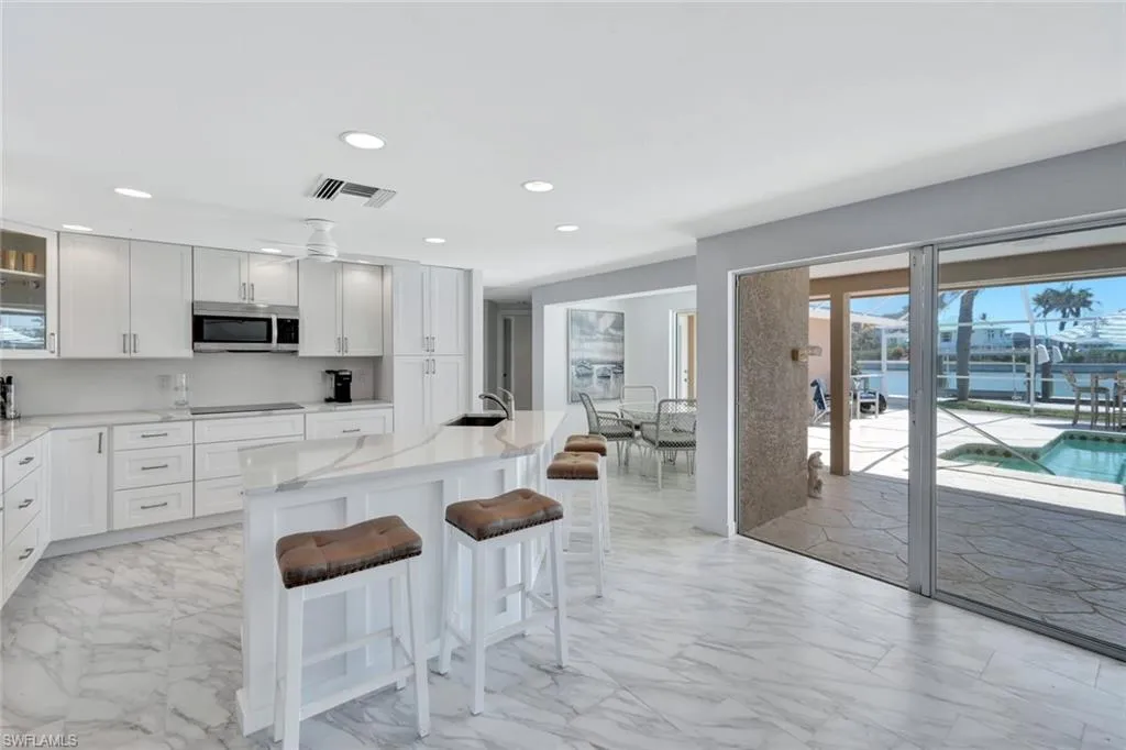 RARE OPPERTUNITY TO PURCHASE A BAY FRONT SOUTHERN EXPOSURE HOME, AND NOT ONLY IS EVERYTHING IN THIS HOME BRAND NEW, BUT WITHOUT A DOUBT IT IS ALL ABOUT THE VIEW!!! If you are lucky enough have the opportunity to call Vanderbilt Beach your home, and you want a very spacious 2344 sq. ft. home with a 2 car garage, complete with boat dock and huge pool, look no further!!! ALL RECONSTRUCTION WAS DONE WITH DURA ROCK CONSTRUCTION. Starting with all new ceramic flooring throughout, the dramatic light filled living room is the first to catch your eye and boasts 20 ft. ceilings with angular windows that bring light in the entire day. From the moment you open the new front door, you see directly out to the expansive bay with sparkling water views. This home has water views from every room, and unusual find!! The new kitchen has white cabinets, stainless appliances, Quartzite counter tops, deep sink, faucets and lighting. The Master is unusually large, featuring 2 walk in closets, with a door to the lanai. The large Master bath with extra room to add additional storage is quite rare. The other 2 bedrooms also are spacious, and the 2nd off the lanai features the added den for possible office space. This home is well built, with an 8-year-old roof, which has a guarantee for 25 years, 2 new HVAC’s, and new hot water heater, The lanai area is screened in covering a 24 by 26-foot pool. Invite all your friends, they certainly will fit! Your new boat will fit easily in the extra-large dock that has a 10,000 lb. lift. only a short ride to The Gulf and Wiggins. Close to Mercato, The Ritz, and LaPlaya, and the sugar sand pristine beaches. What is not to like??? And at this price, your new dreams in Paradise can easily come true!!!!!!!!