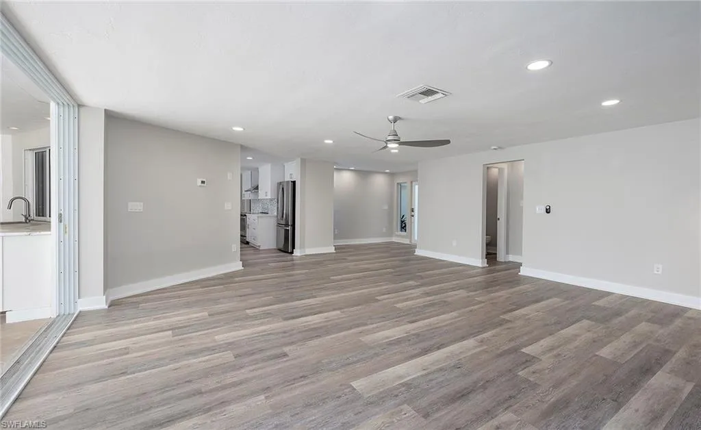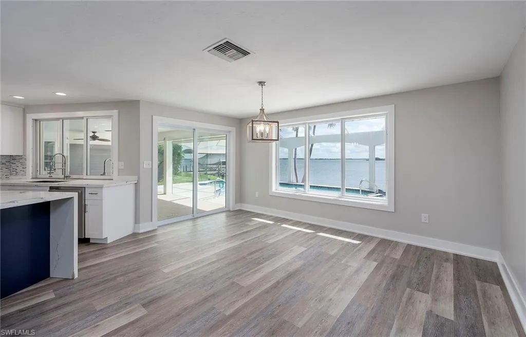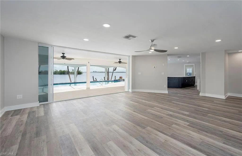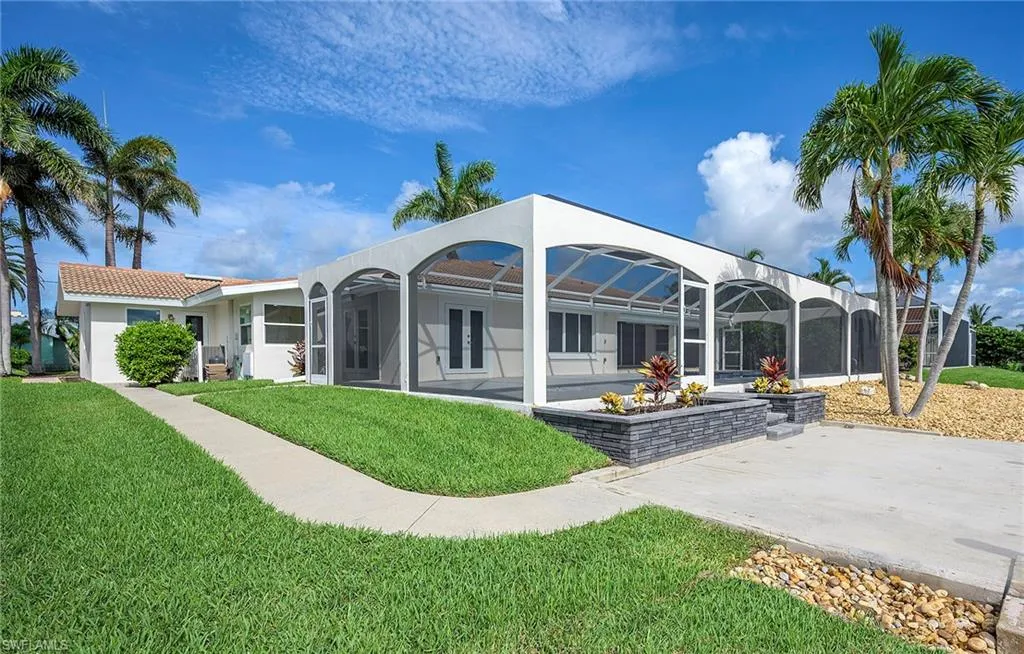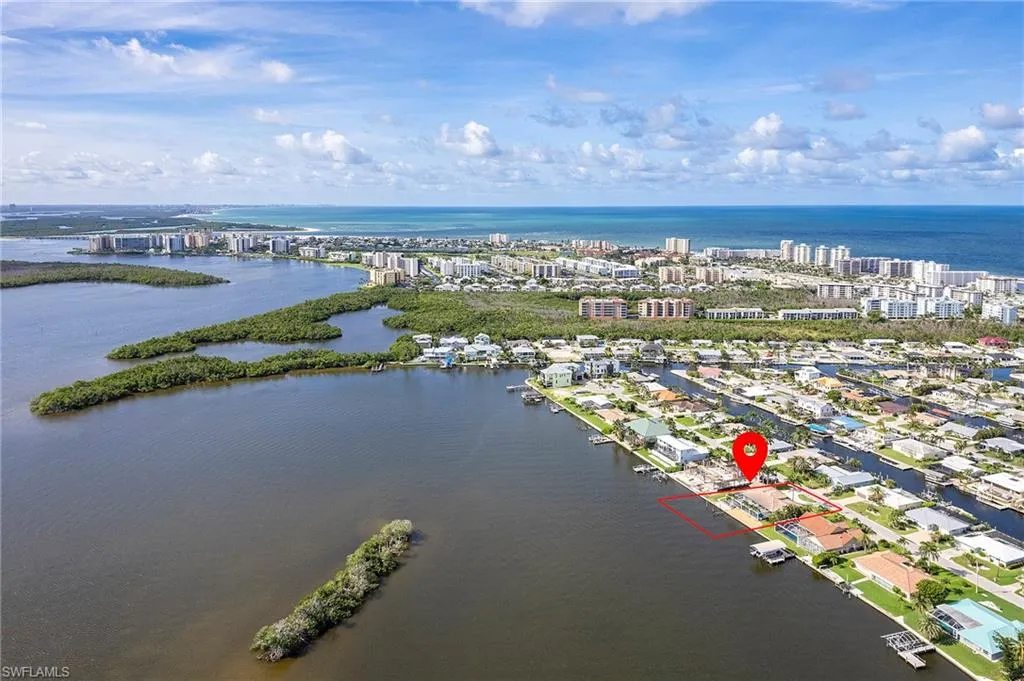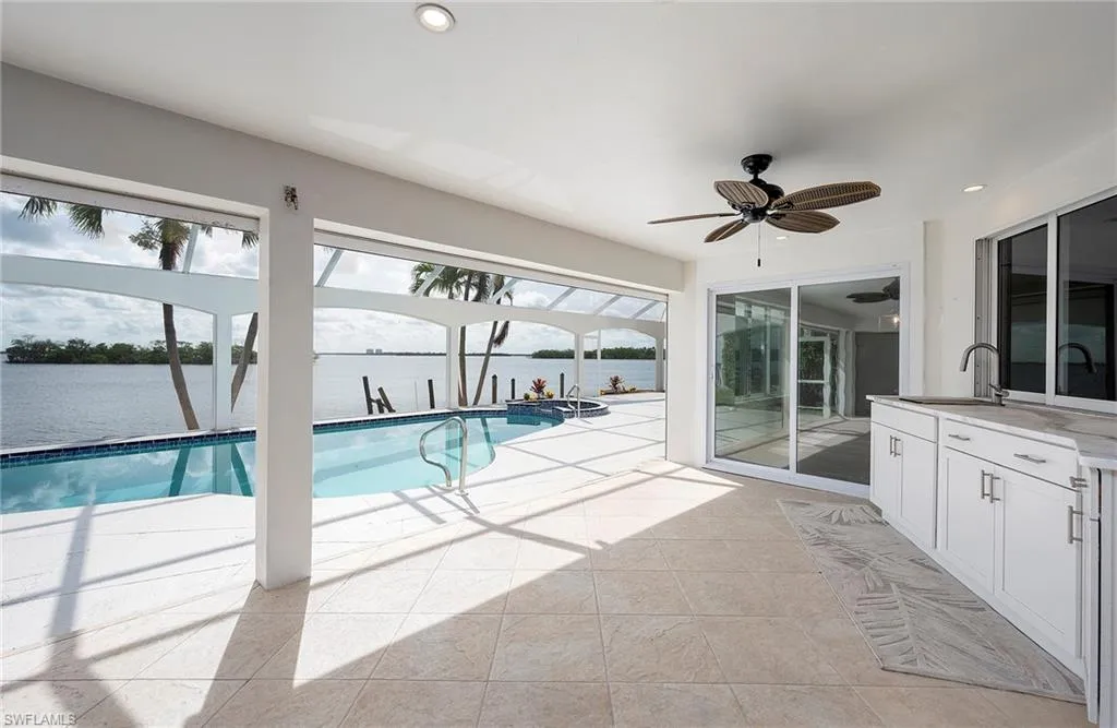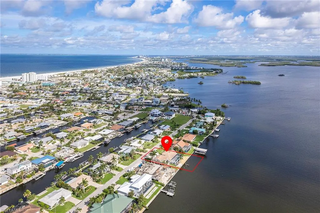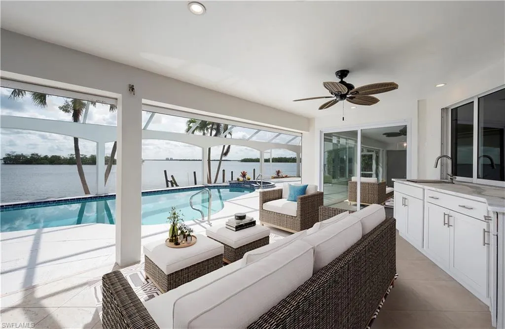 Direct Gulf Access Bayfront home with breathtaking views of Estero Bay Aquatic Preserve. As you enter the front door the Spacious 2379 sq ft open floorplan has been completely renovated. To the right is the open kitchen and dining area with pass through window to the lanai. That area sprawls out to the Master Bedroom suite with full bath including a soaking tub and spacious walk in closet. Continuing on the right side of the house is another bedroom. Open door to the garage with laundry area and an addition off the garage which can be used as a quiet office or hobby room. To the left of the entrance is a 2nd bedroom suite, a powder room and a quaint, unique den area featuring a fireplace, tiger wood and a vaulted ceiling. The den closes with French door pocket sliders for privacy. From the great room, step outside for a clear panoramic waterfront view from the Colonnade screened lanai with pool and spillover spa. Hurricane shutters close off the lanai area. The outdoor lanai also has a wet bar on the other side of the kitchen pass through window. Enjoy daily natural wonders of waterbirds, dolphins, fishing, sunrise and sunset and boaters going by on the main channel. One of the largest properties still available on the bay. OVERSIZE Lot size is 100×120 with 100 ft of waterfront. Majestic Palms compliment this Fairview Isles bayfront paradise. Indoor/outdoor living area is nearly 5000 sq ft.