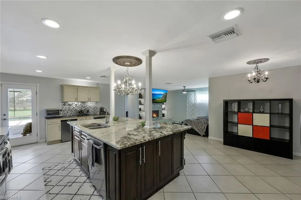 Discover this beautiful spacious home in the highly sought-after Four Seasons neighborhood in North Naples. Situated on almost 1 acre, this stunning property offers privacy, convenience and an unbeatable Florida lifestyle—all with no HOA fees! Step outside to your expansive south-facing lanai, where a heated pool and hot tub with LED lighting await. The caged outdoor oasis is perfect for relaxing or entertaining year-round. Inside, the home boasts two master suites with split-bedroom design, ideal for multi-generational living or hosting guests. The kitchen is a chef’s dream, featuring an oversized island with exotic granite, a wine fridge, and a cozy eating area. All this, just minutes from Naples’ beautiful beaches, top-rated schools and fine dining.