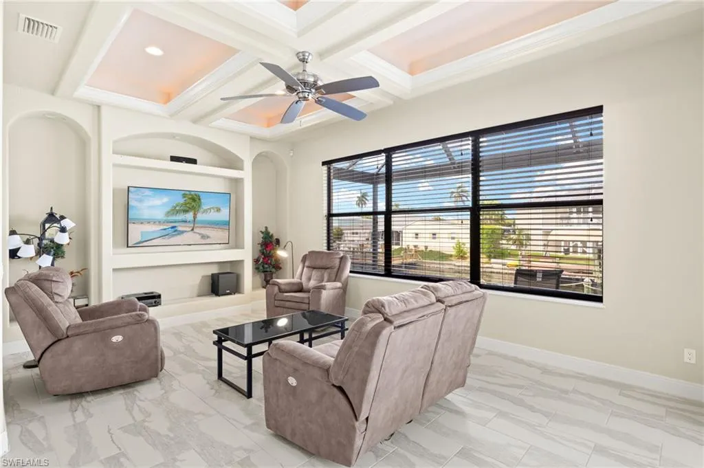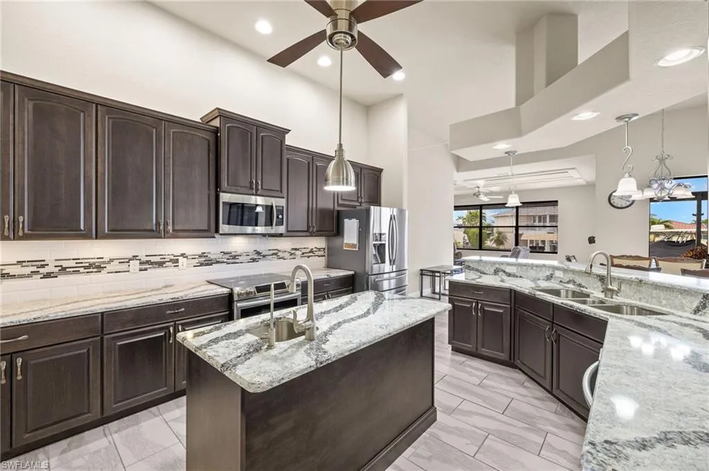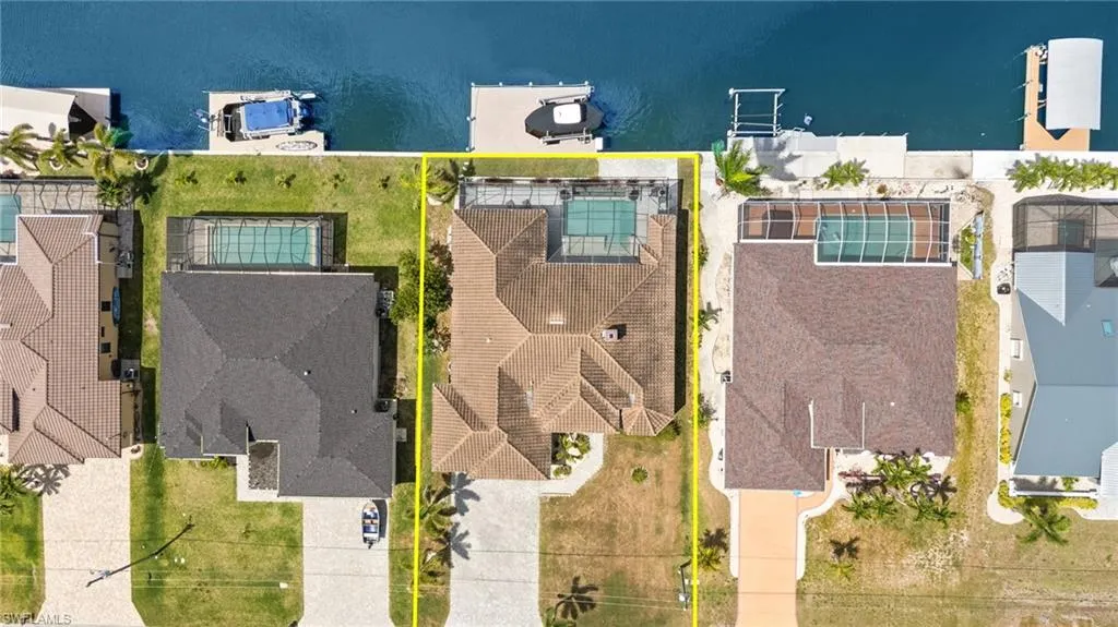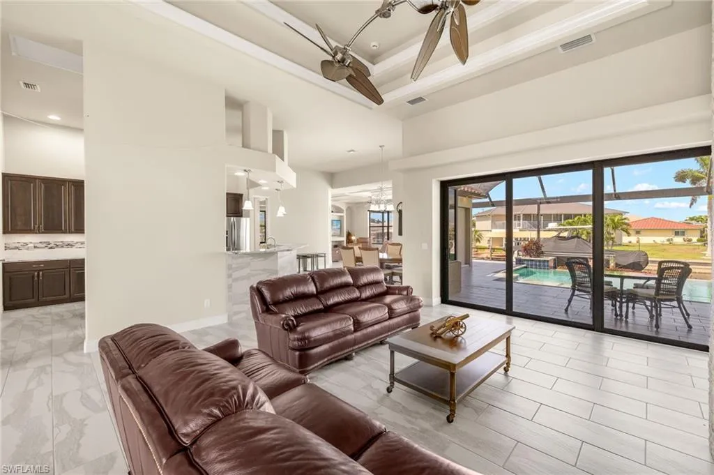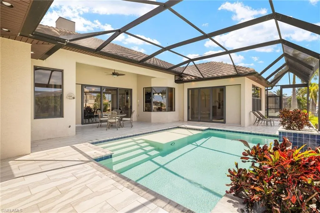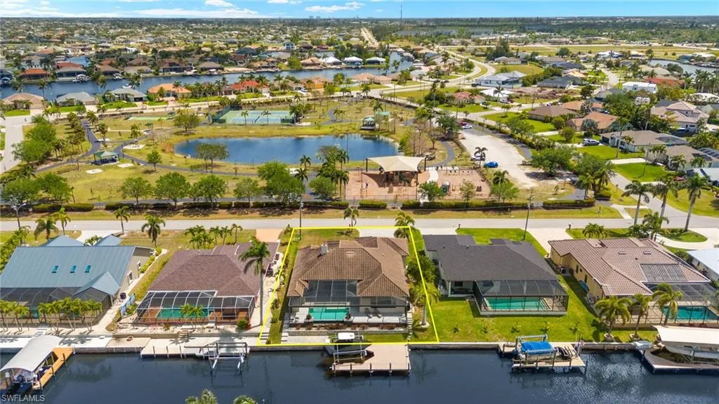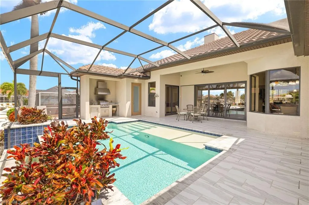 …….Welcome to this High End, Direct Gulf Access, Four Bedroom Luxury Canal Pool Home in Cape Coral with air conditioned three car oversized garage and its own bathroom plus 10 foot tall garage doors!! Keep your boat in your “back yard canal” for ultimate convenience. Beautiful composite captains boat dock and 10,000 lb. lift will accommodate up to a 35′ boat. Less than one mile and no bridges to exit the canal system – then enter the gorgeous bay for fishing, enjoy a leisure day on the water, or travel north to Charlotte Harbor or south to Sanibel and Fort Myers Beach or out to the Gulf! Two sets of pocketing sliders open up to the inviting lanai featuring a sparkling infinity pool with sunning shelf. The roomy pool deck and outdoor kitchen help make this a perfect Florida get away or year round home. High end cabinetry, quartz counters in kitchen and bathrooms, 12ft. tall ceilings, beautiful stone fire place, high Impact windows and sliders, dedicated pool bath, plus many more great touches. No storm shutters needed and the home had no damage from recent storms with the exception of lanai screens. Two of the bedrooms share the master bathroom which is perfect for a 2 bedroom master suite or master suite with private sitting/flex room overlooking the sparkling pool. This home sits high and dry in one of the finest areas of Cape Coral. Beautiful Joe Stonis park is across the street with tennis, pickleball, walking paths, and shaded playground.