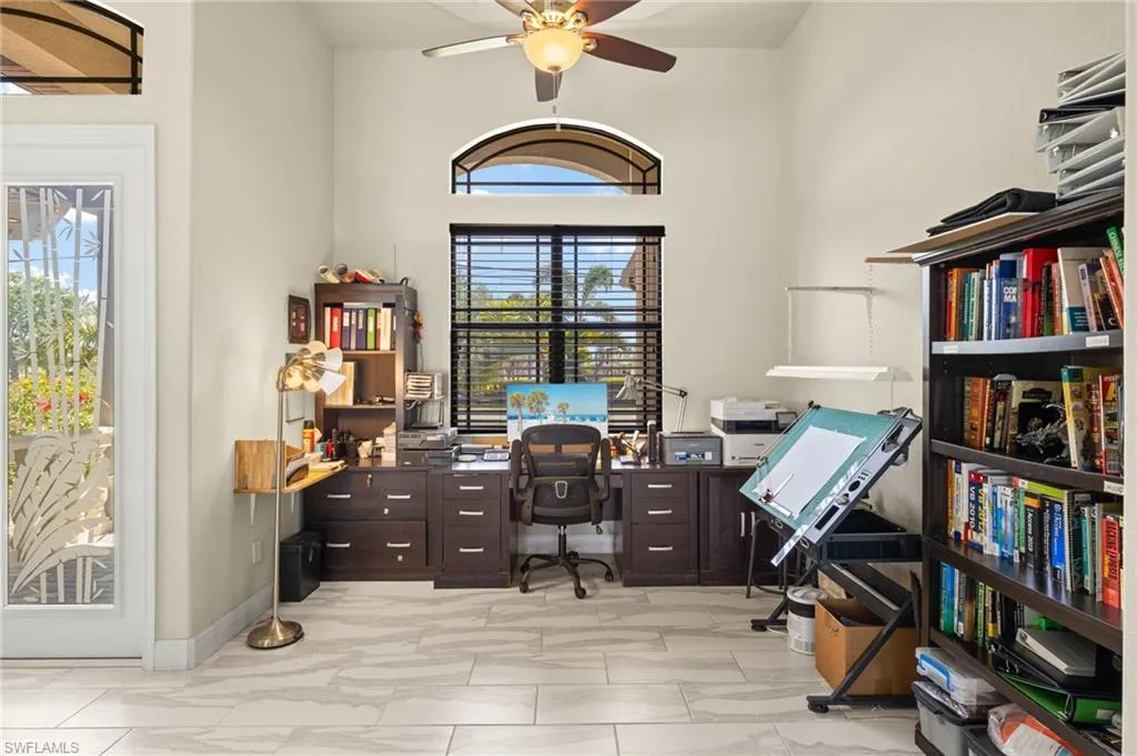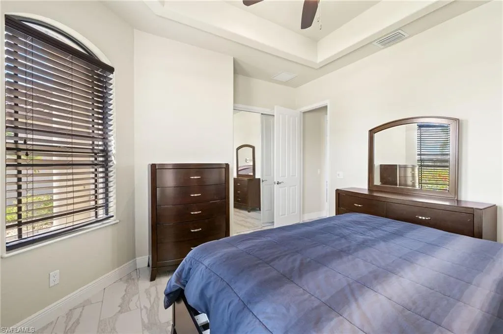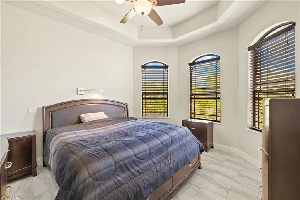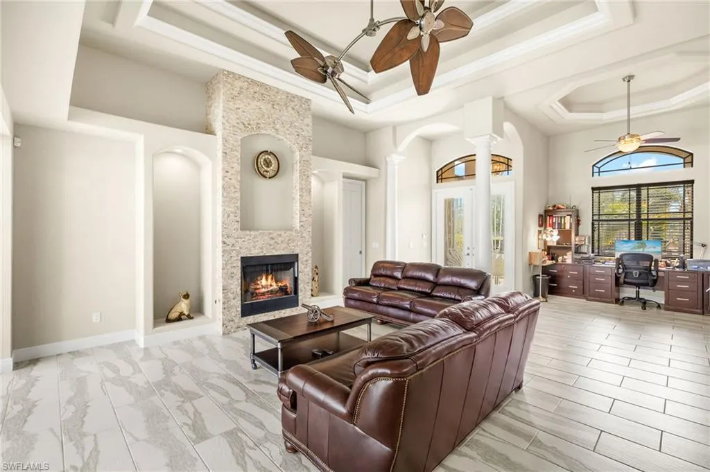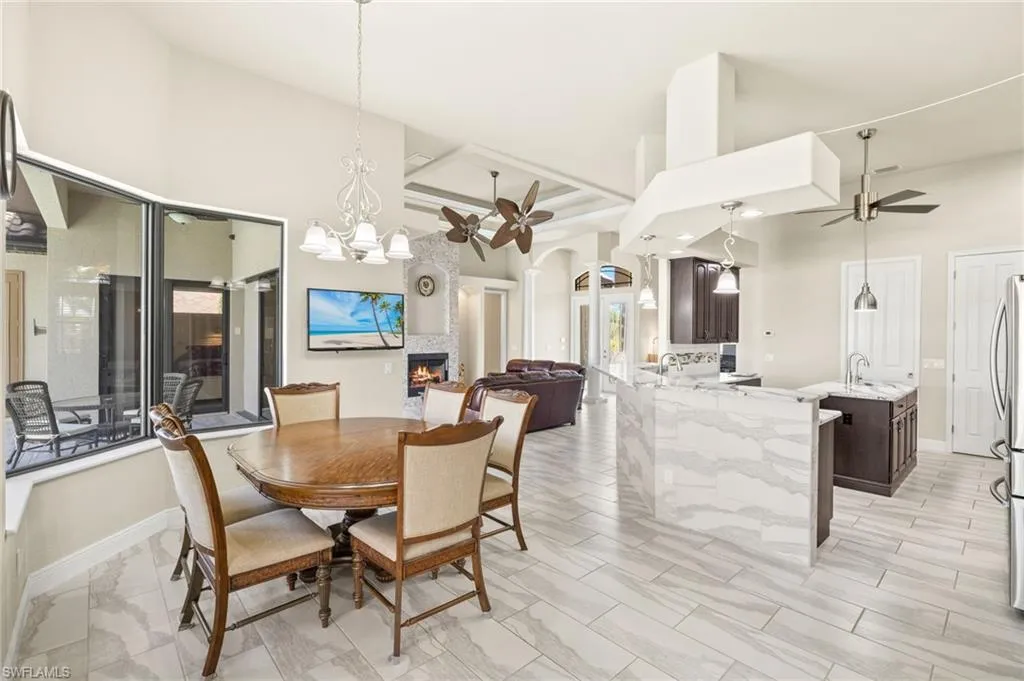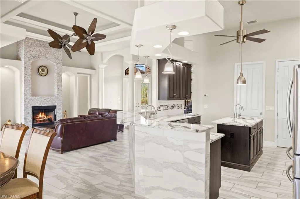 …….Welcome to this High End, Direct Gulf Access, Four Bedroom Luxury Canal Pool Home in Cape Coral with air conditioned three car oversized garage and its own bathroom plus 10 foot tall garage doors!! Keep your boat in your “back yard canal” for ultimate convenience. Beautiful composite captains boat dock and 10,000 lb. lift will accommodate up to a 35′ boat. Less than one mile and no bridges to exit the canal system – then enter the gorgeous bay for fishing, enjoy a leisure day on the water, or travel north to Charlotte Harbor or south to Sanibel and Fort Myers Beach or out to the Gulf! Two sets of pocketing sliders open up to the inviting lanai featuring a sparkling infinity pool with sunning shelf. The roomy pool deck and outdoor kitchen help make this a perfect Florida get away or year round home. High end cabinetry, quartz counters in kitchen and bathrooms, 12ft. tall ceilings, beautiful stone fire place, high Impact windows and sliders, dedicated pool bath, plus many more great touches. No storm shutters needed and the home had no damage from recent storms with the exception of lanai screens. Two of the bedrooms share the master bathroom which is perfect for a 2 bedroom master suite or master suite with private sitting/flex room overlooking the sparkling pool. This home sits high and dry in one of the finest areas of Cape Coral. Beautiful Joe Stonis park is across the street with tennis, pickleball, walking paths, and shaded playground.