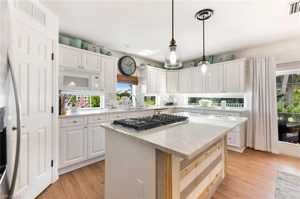 PRICE REDUCTION! GREAT VALUE! Welcome to Burnt Store Lakes to a home with NO history of flooding and no damages from Ian, Helene or Milton! If you are looking for a home with character and charm and are not fond of “cookie-cutter” new homes, this could be the home for you! Surrounded by an HOA green space, creating a very private setting, you will be amazed at the natural habitat of tortoises, birdlife, rabbits and even the occasional pair of eagles. Four beautiful French doors open to a large screened lanai leading to a spacious 12×16 deck. The kitchen has been completely redone, and the home has all new laminate flooring, vaulted ceilings and a new electric fireplace for those chilly evenings. Roof was replaced in 2021 and the home has full hurricane shutters, accordion and Bahama-style. Third garage space has been converted to a second bedroom or office/den, completely private from master en suite. Located across from Burnt Store Marina, with a 27-hole golf course, restaurant, and the favorite Cass Cay restaurant, all only a golf cart ride away. Florida living at its best, you couldn’t find a more reasonably priced home with so many wonderful features! Come have your morning coffee with the eagles!