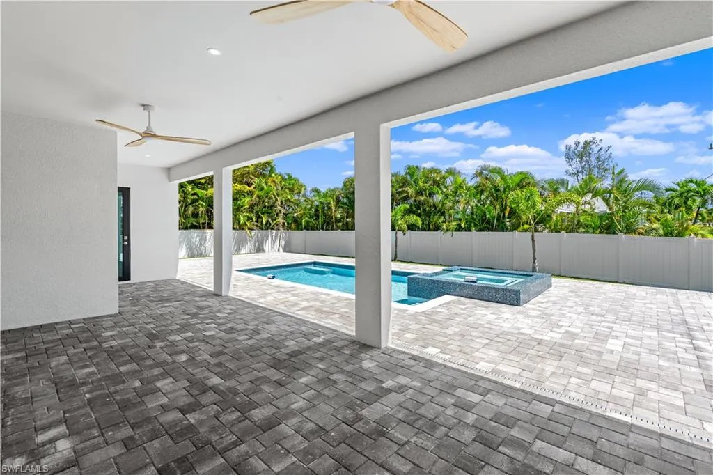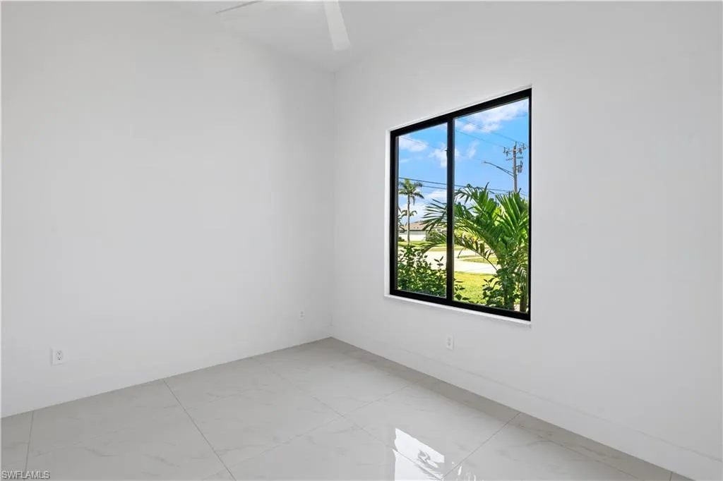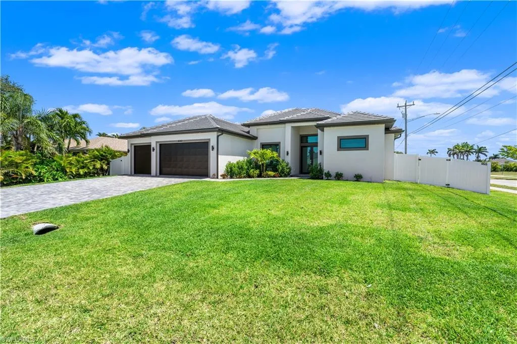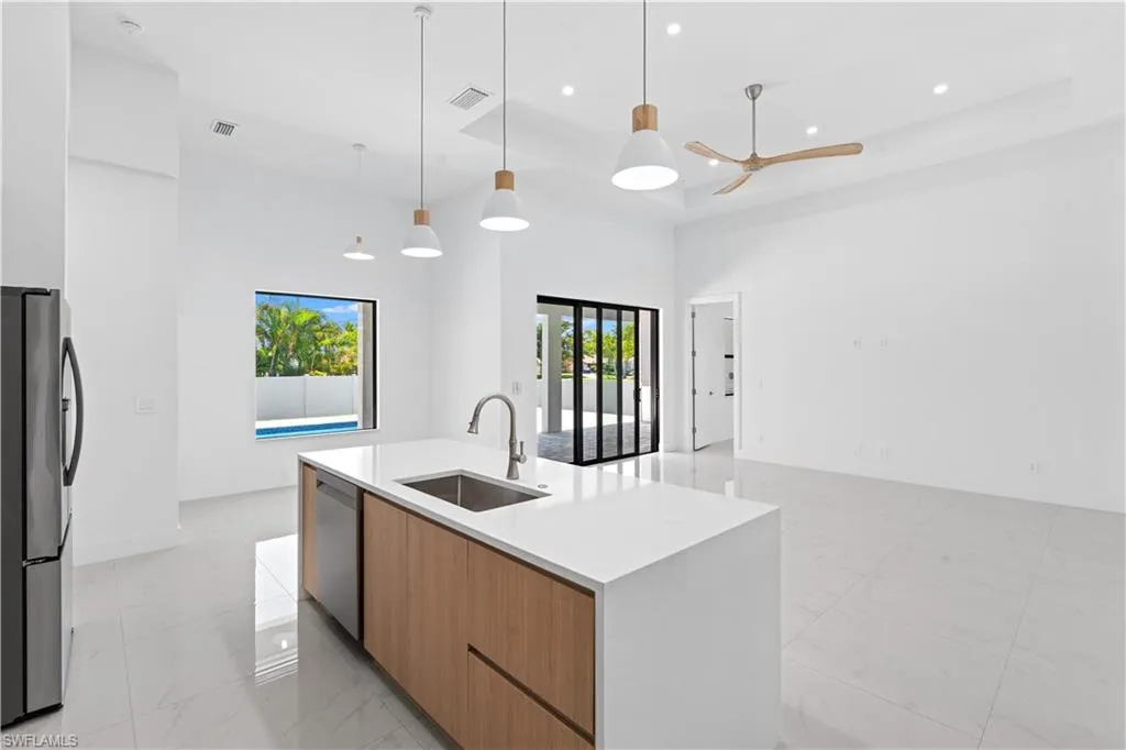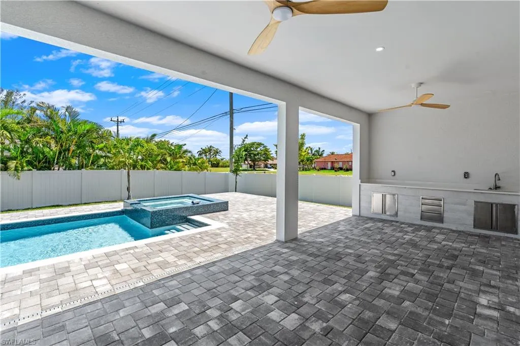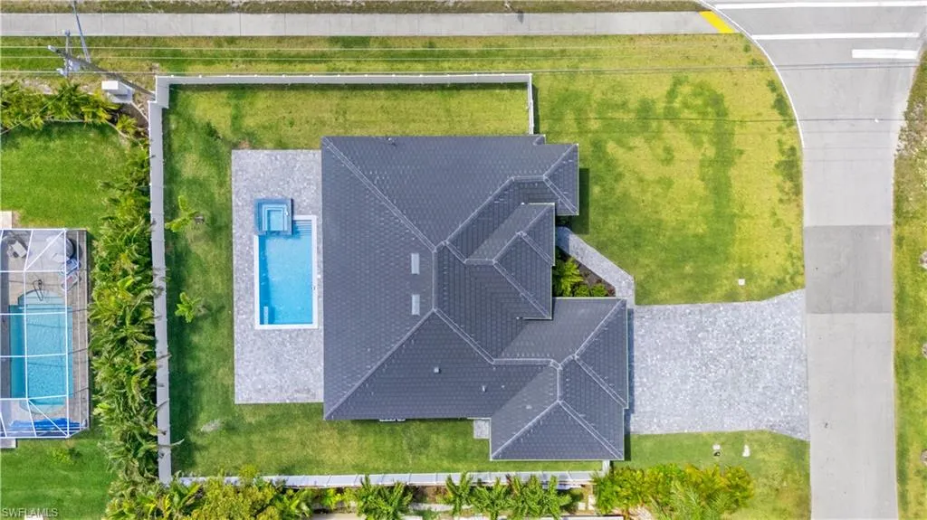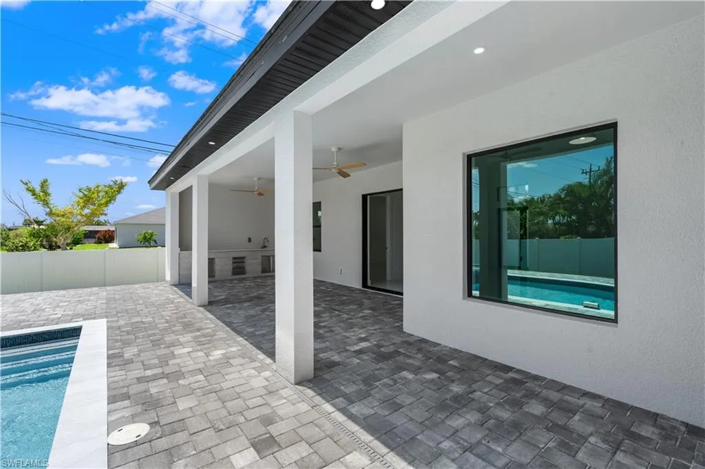 Stunning new construction home, built with hurricane impact windows and doors, a sleek modern tile roof, offering 4 bedrooms, 3 bathrooms, 3 car garage, and 1,931 sqft of living space on a desirable corner lot in SW Cape Coral. Enter through elegant French doors with frosted glass panels into a bright, open layout featuring large polished marble tile flooring throughout and soaring ceilings with recessed lighting. The modern kitchen showcases quartz countertops, light wood cabinetry with sleek white uppers, and pendant lighting above the spacious island. The primary suite includes two walk-in closets with custom built-in shelving, and a luxurious spa-like bath with a freestanding soaking tub, dual walk-in showers with frameless glass enclosures, double vanity with quartz countertops, and recessed lighting. Three additional bedrooms offer modern comfort with ceiling fans, walk-in closets and access to two additional full bathrooms, one being an additional ensuite and a pool bath that leads outdoors. The home also includes a dedicated laundry room with a wash sink for added convenience. Wall-to-wall sliding glass doors open to a covered lanai with a built-in outdoor kitchen, private pool and spa, outdoor shower and a fully fenced backyard—ideal for entertaining or relaxing in privacy. Prime location surround by beautiful homes with quick access to Cape Harbour, Tarpon Point, Sands Park, Downtown Cape Coral, and nearby beaches. Some photos include virtual staging. *DESIGN SERVICES INCLUDED, MAKING IT EASY FOR THE BUYER TO FURNISH THE PROPERTY AS SHOW*